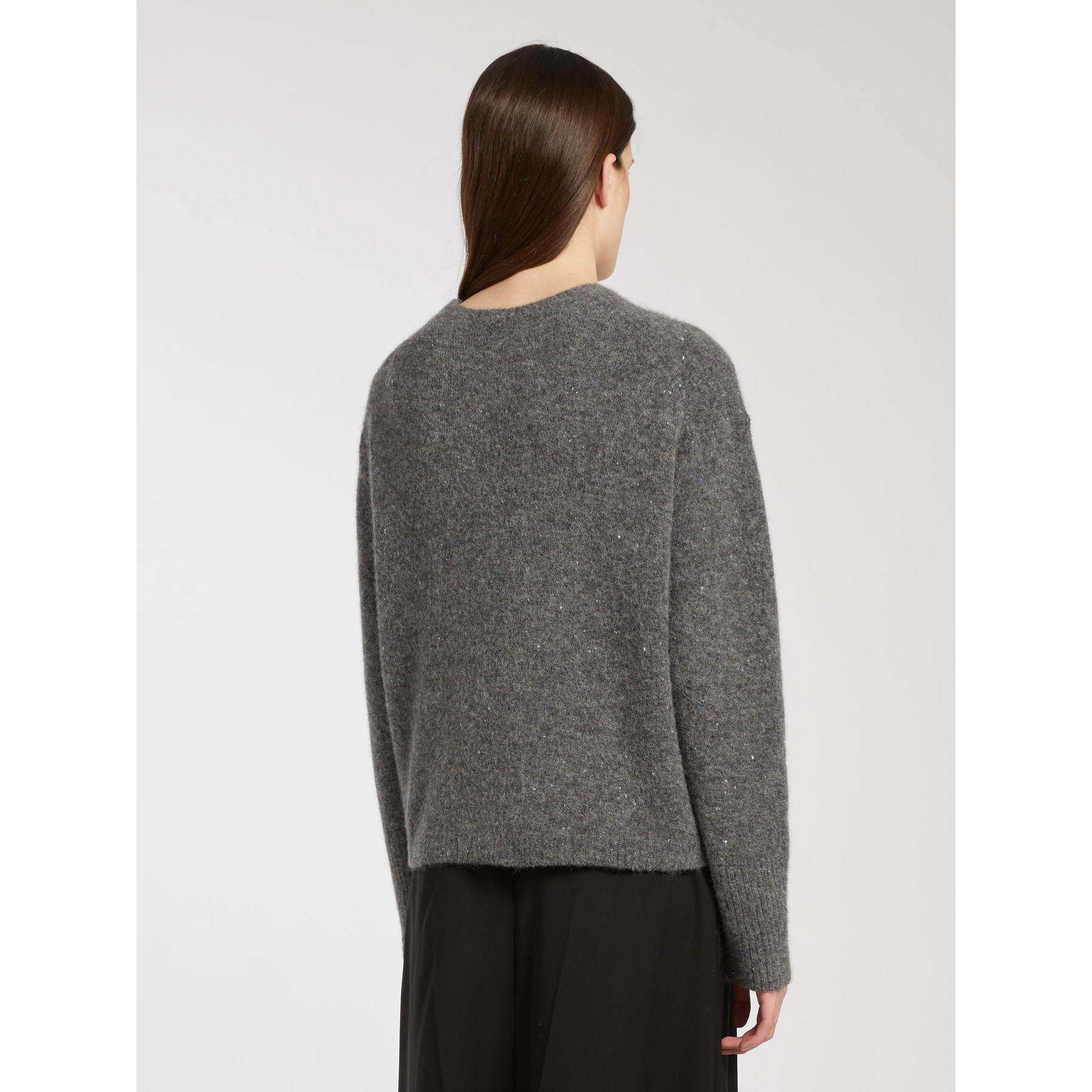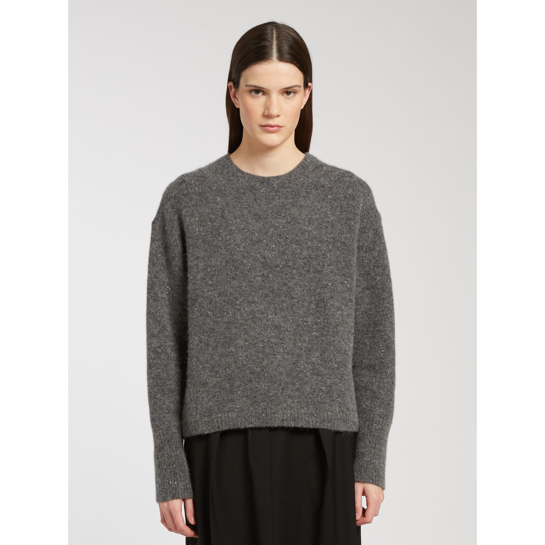 Soft, stretch alpaca sweater with a boxy fit and generous volume at the shoulders. The buttoned yarn lends a textured, slightly three-dimensional feel, pairing harmoniously with the flowing viscose skirt.