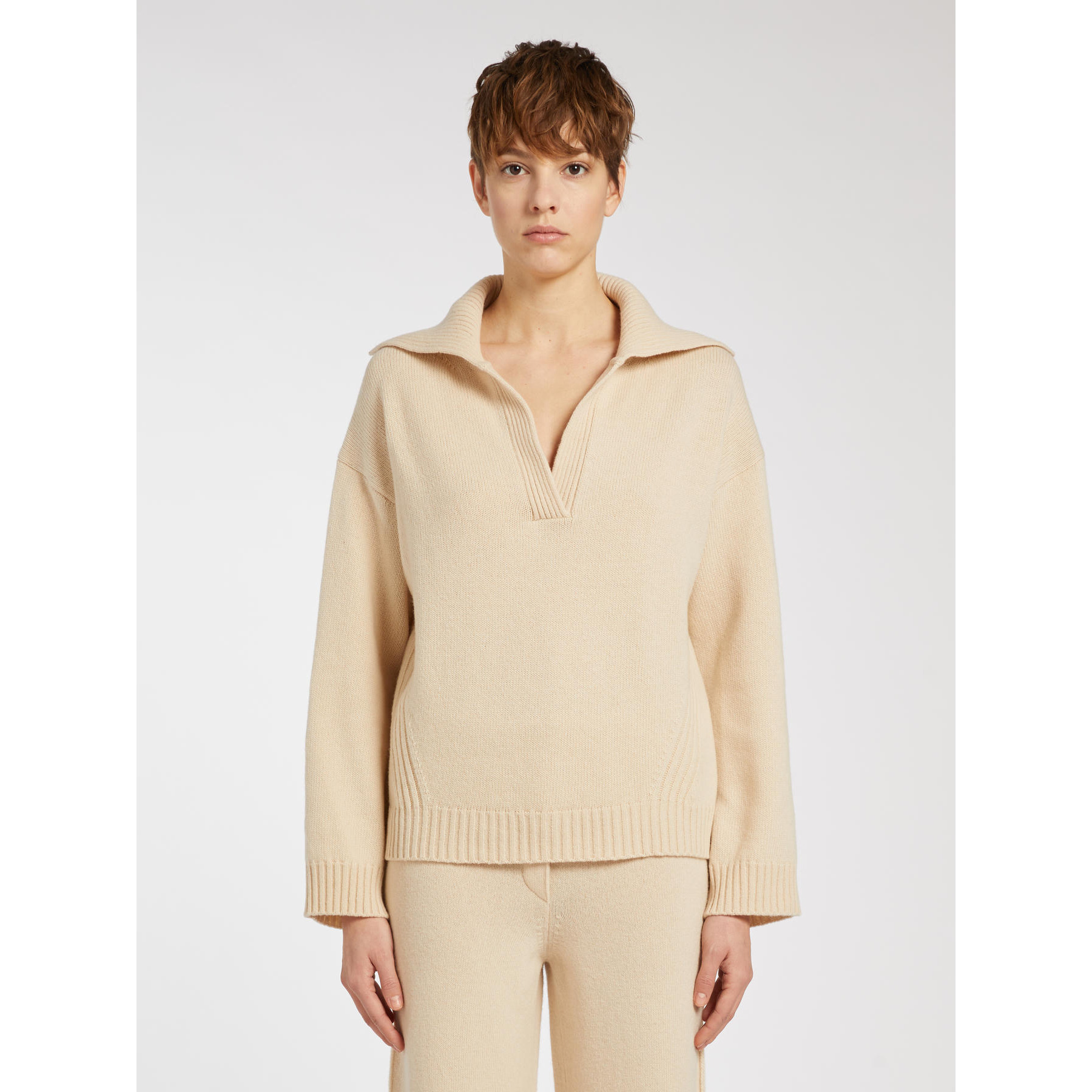 Boxy lines and a polo collar define this casual sweater. Pair it with matching joggers for a super-contemporary active-chic style.