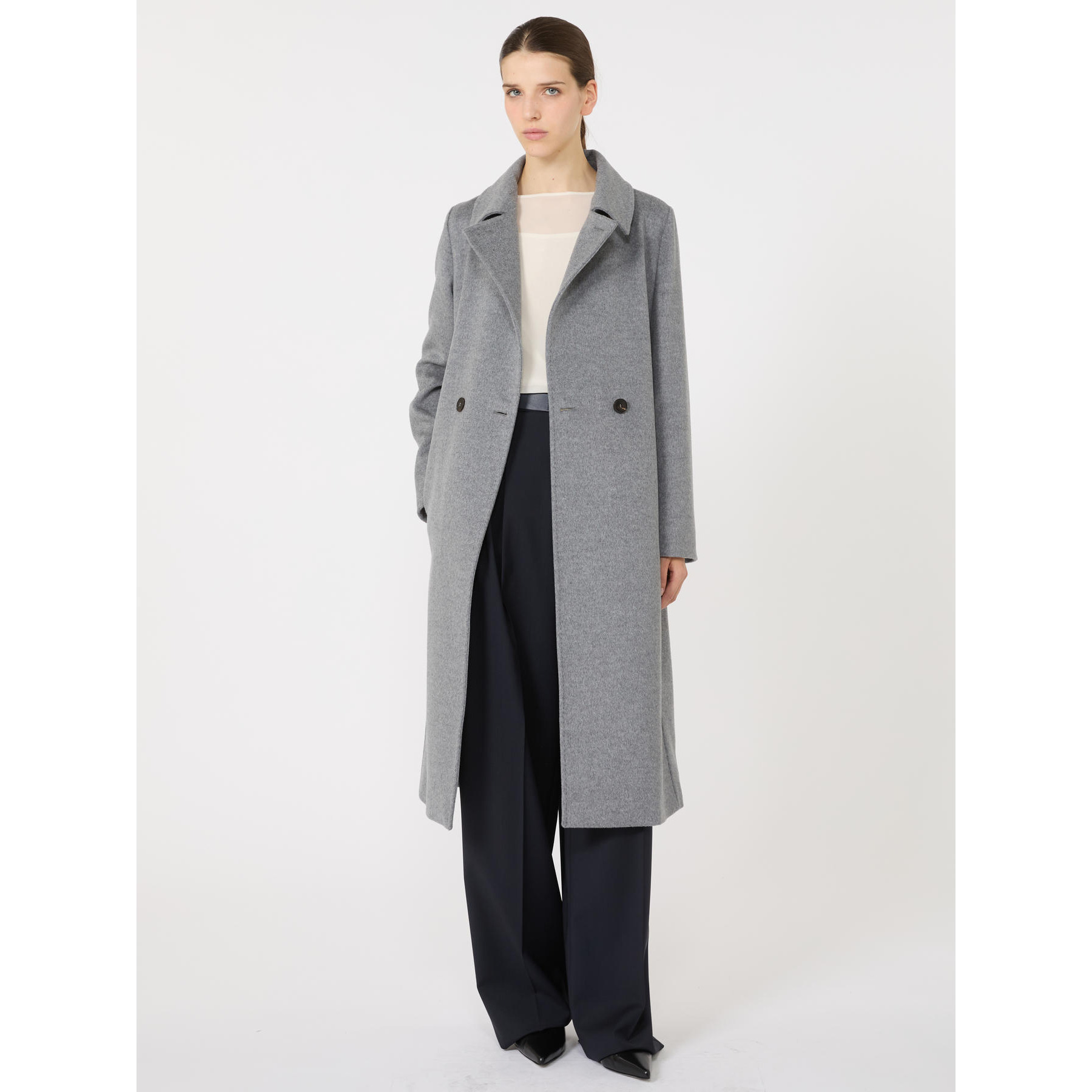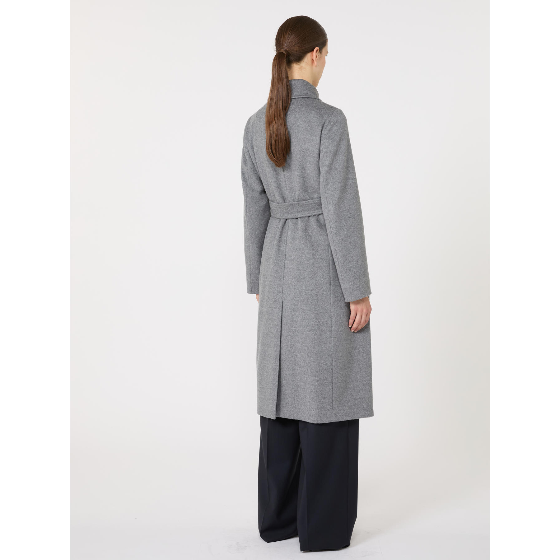 Long coat with a wrap-like silhouette with a slit on the back.