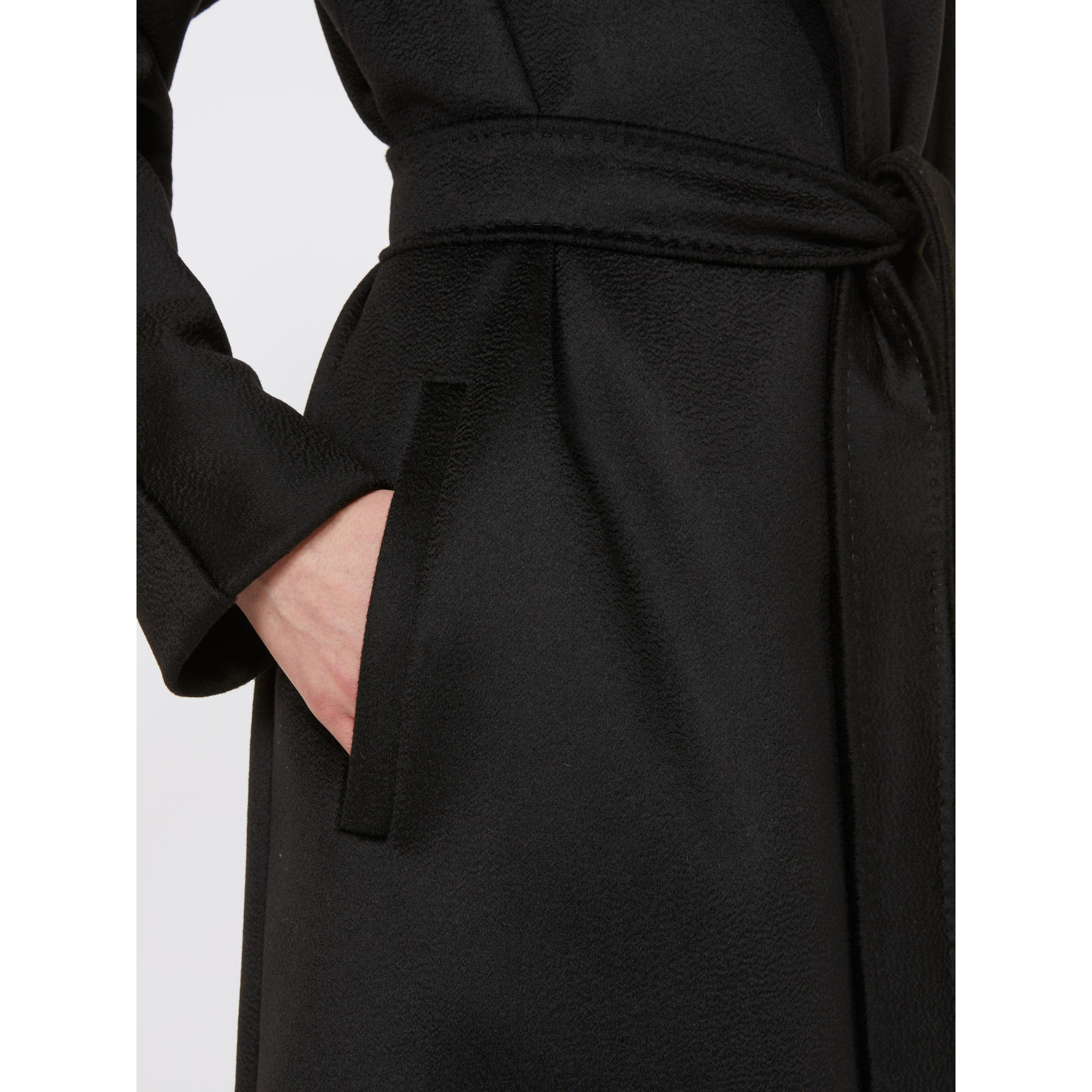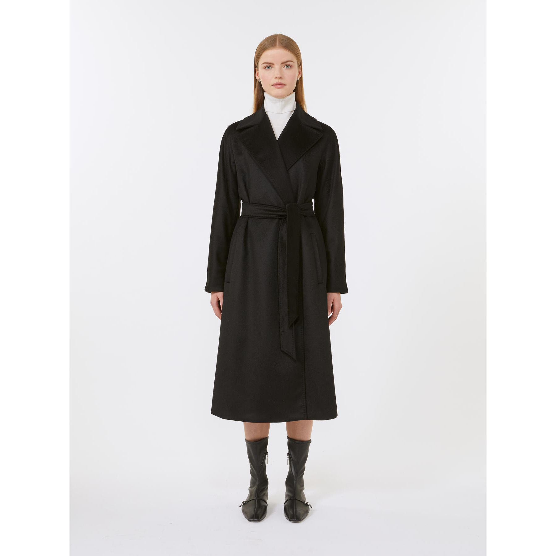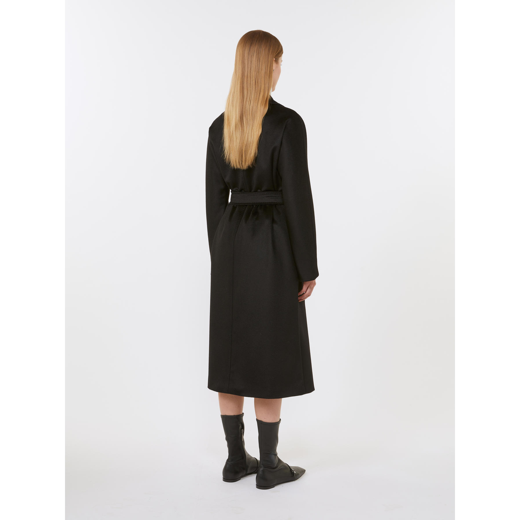 Tailored coat made of fine pure cashmere drap. A model with a feminine silhouette, which enhances and defines the figure with essentiality. Coat in pure sable cashmere drap Semi-fitted fit with flared silhouette Classic lapel collar Long kimono sleeves Coat with coordinated belt to define the waistline Welt pockets and sartorial dot finishing