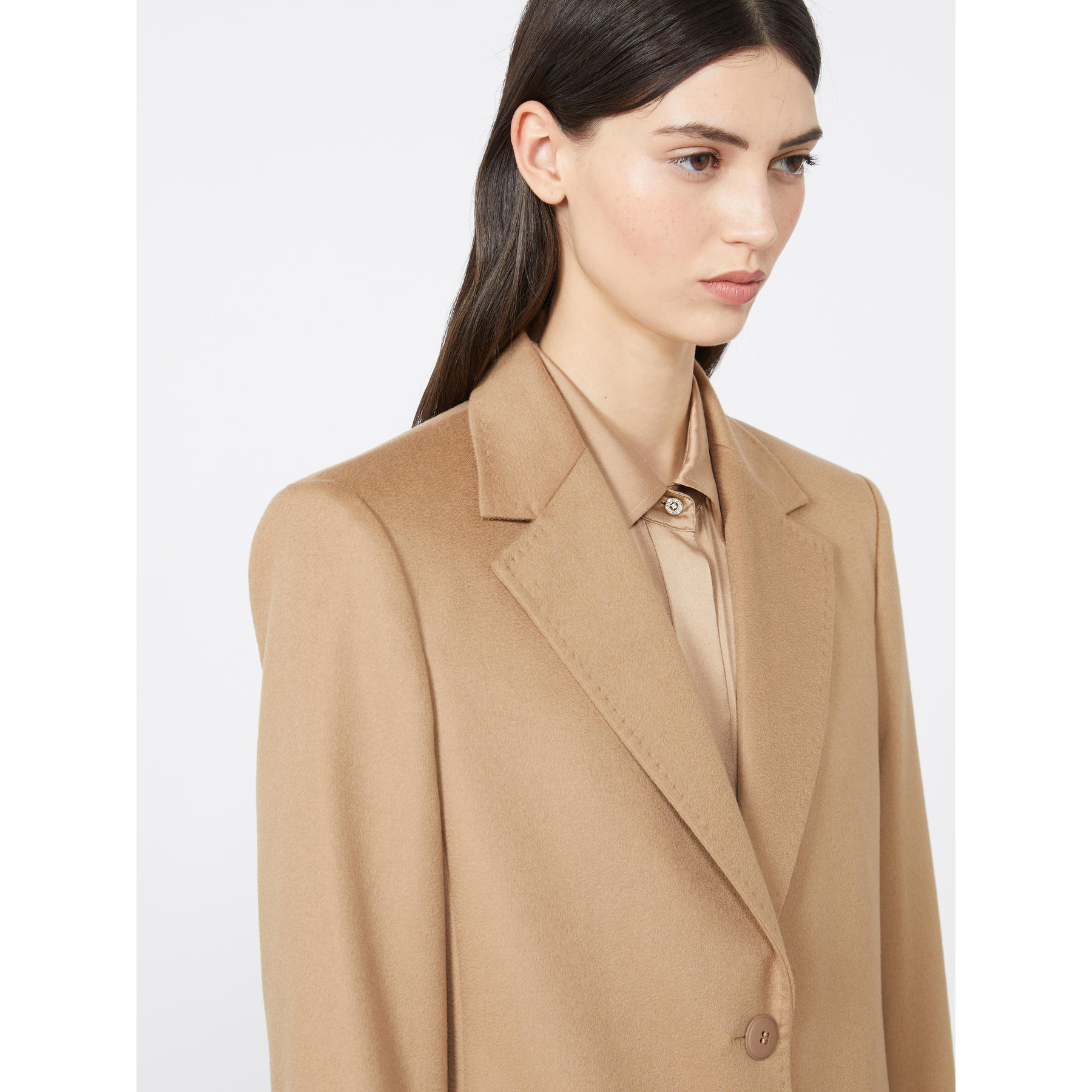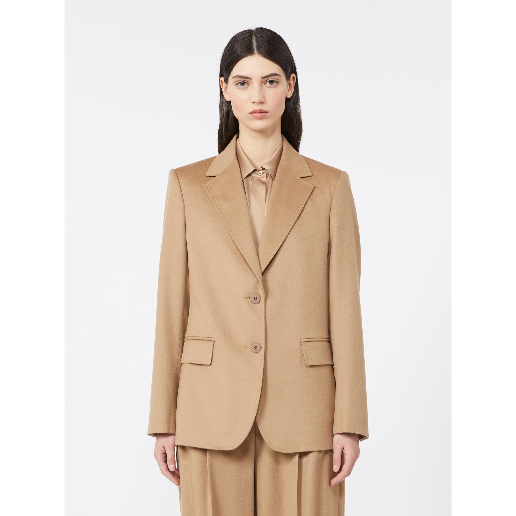 Women's single-breasted blazer with tailored line and slipped silhouette. Lined pure wool drap blazer Slipped fit with single-breasted line Classic lapel collar Set-in sleeves with buttons at the bottom Front closure with two buttons Pockets with flap applied on the front Central rear vent