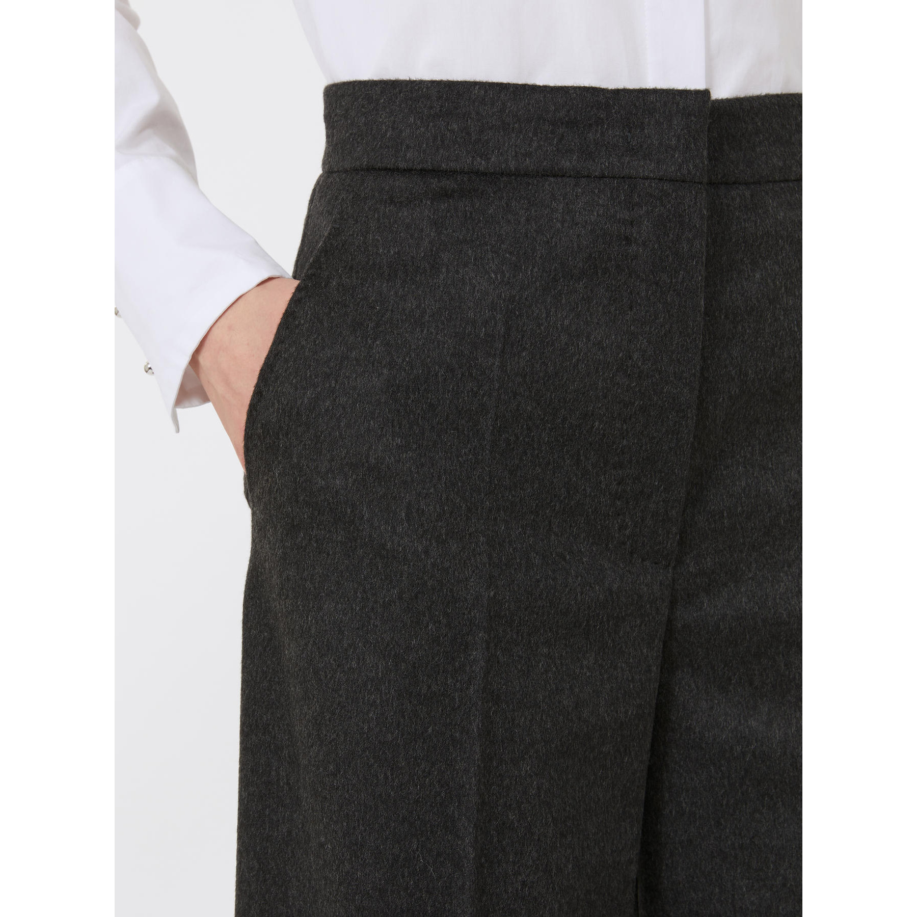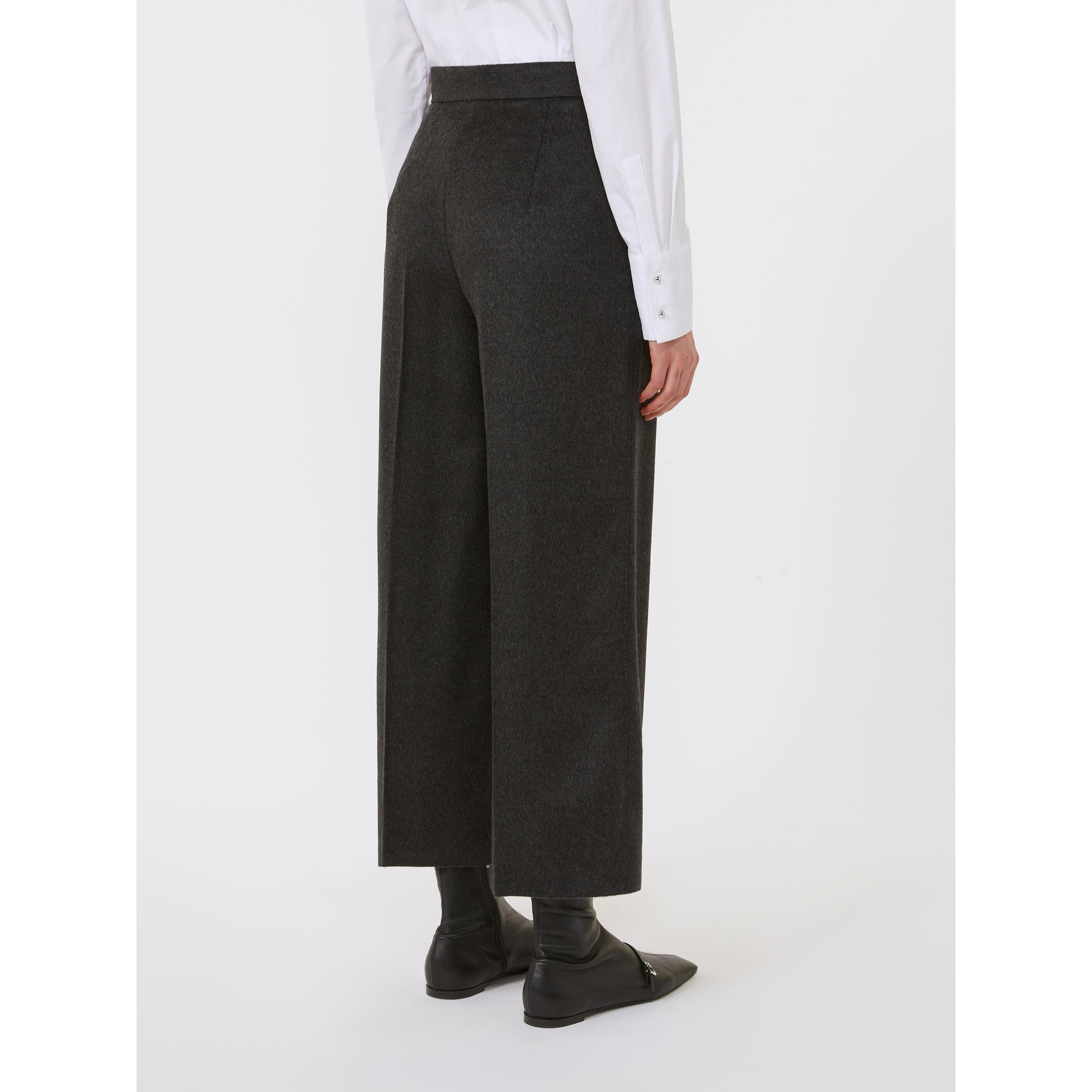 A trousers with contemporary lines, with a loose fit. The light wool drap accompanies movement with lightness and structure. Light pure wool drap trousers Loose fit and wide leg Closure with high waistband, zip with flap and hook French pockets on the sides Pressed crease and darts sewn on the waist on the back