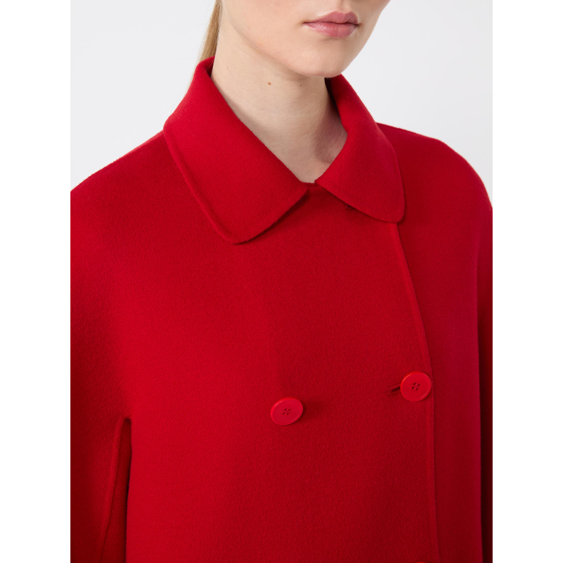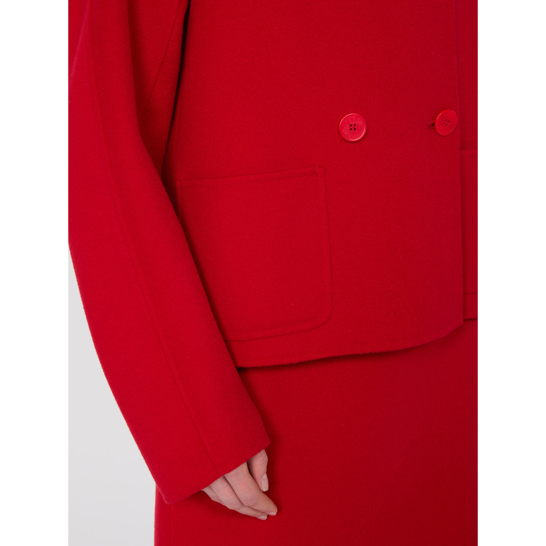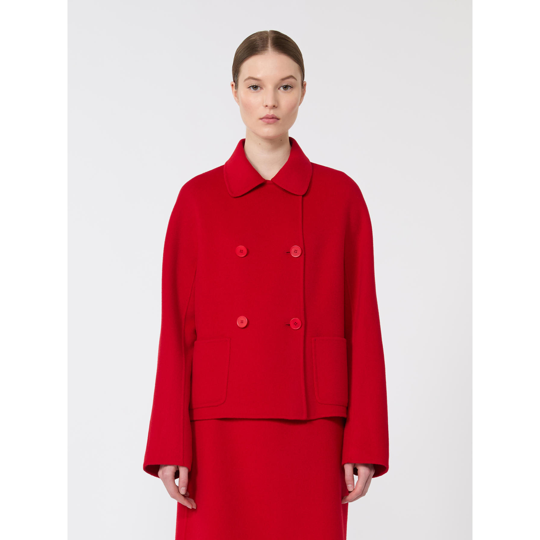 Short, double-breasted jacket with rounded collar.