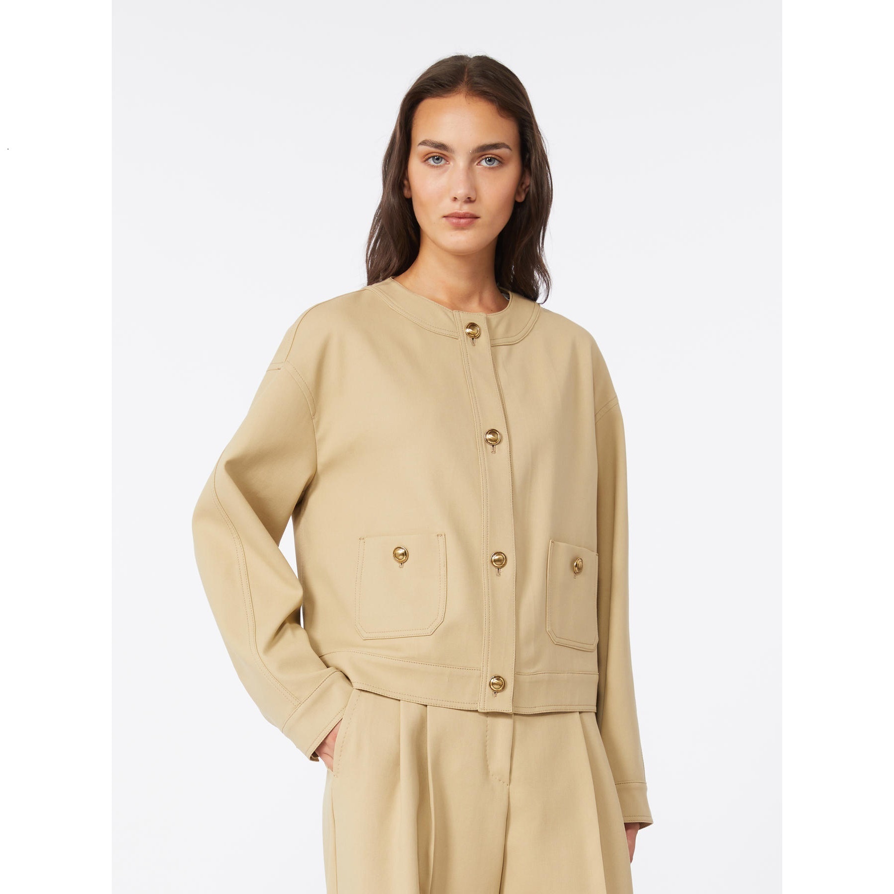 Feminine jacket with front patch pockets and decorative buttons.