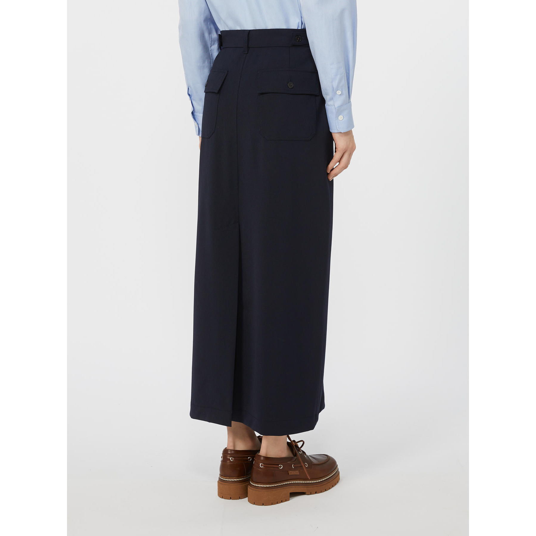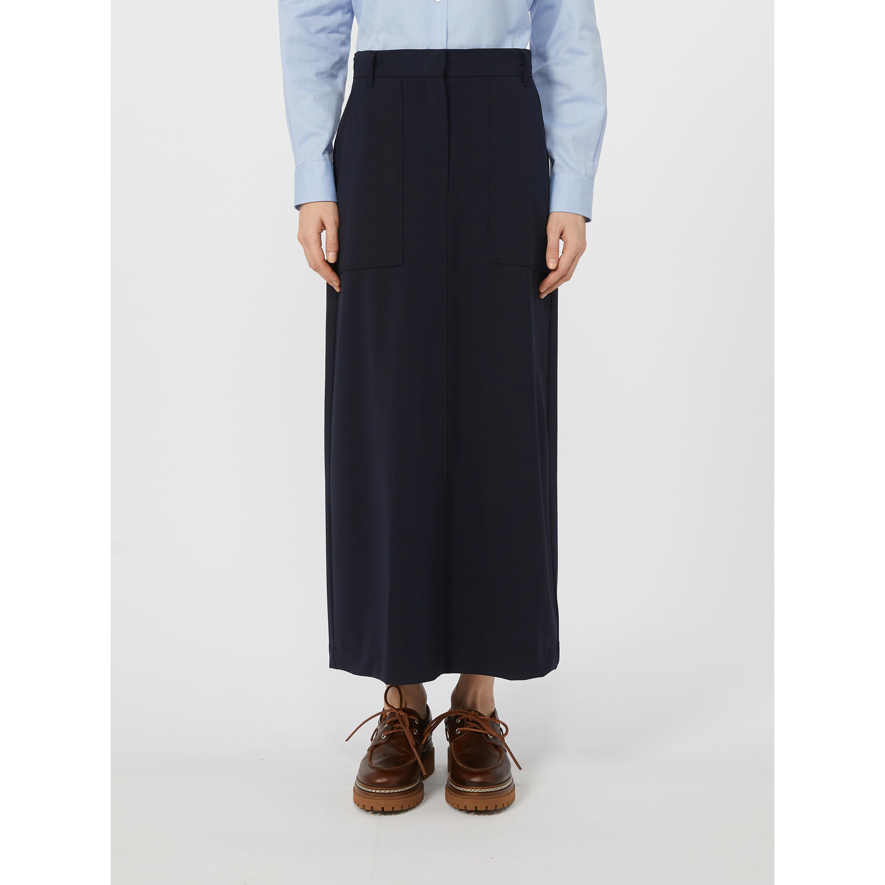 Long skirt with workwear details, belt loops and toggles on the sides with buttons.