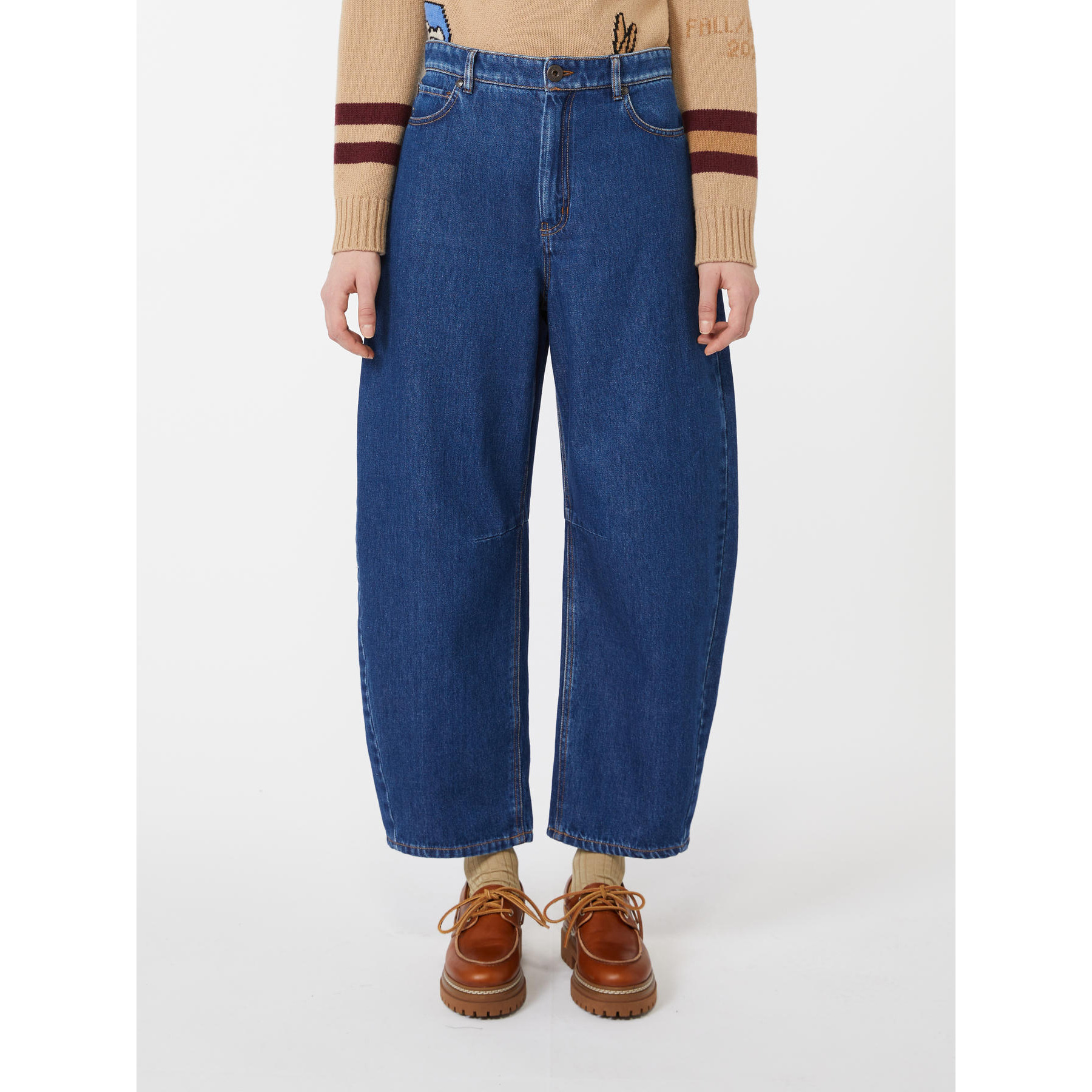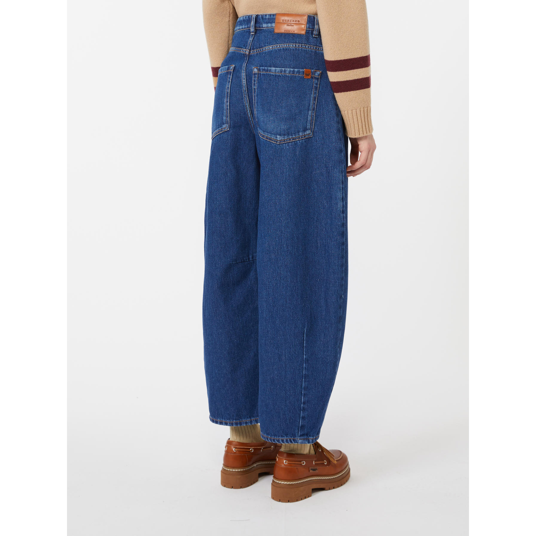 5-pocket jeans, featuring a barrel leg silhouette with darts sewn at the knee and at the bottom.