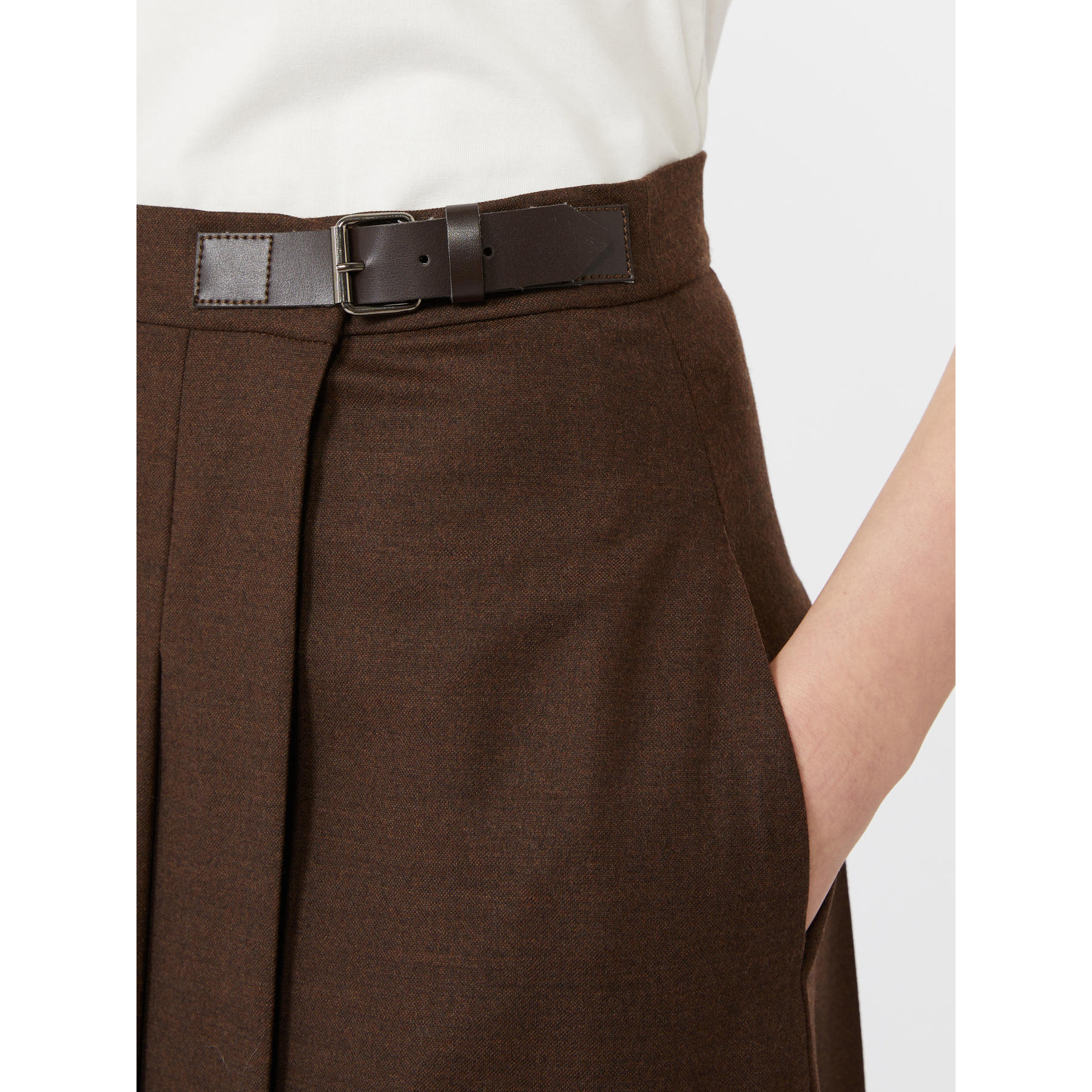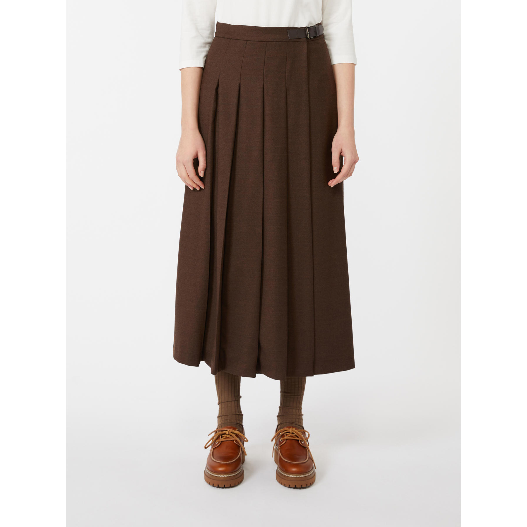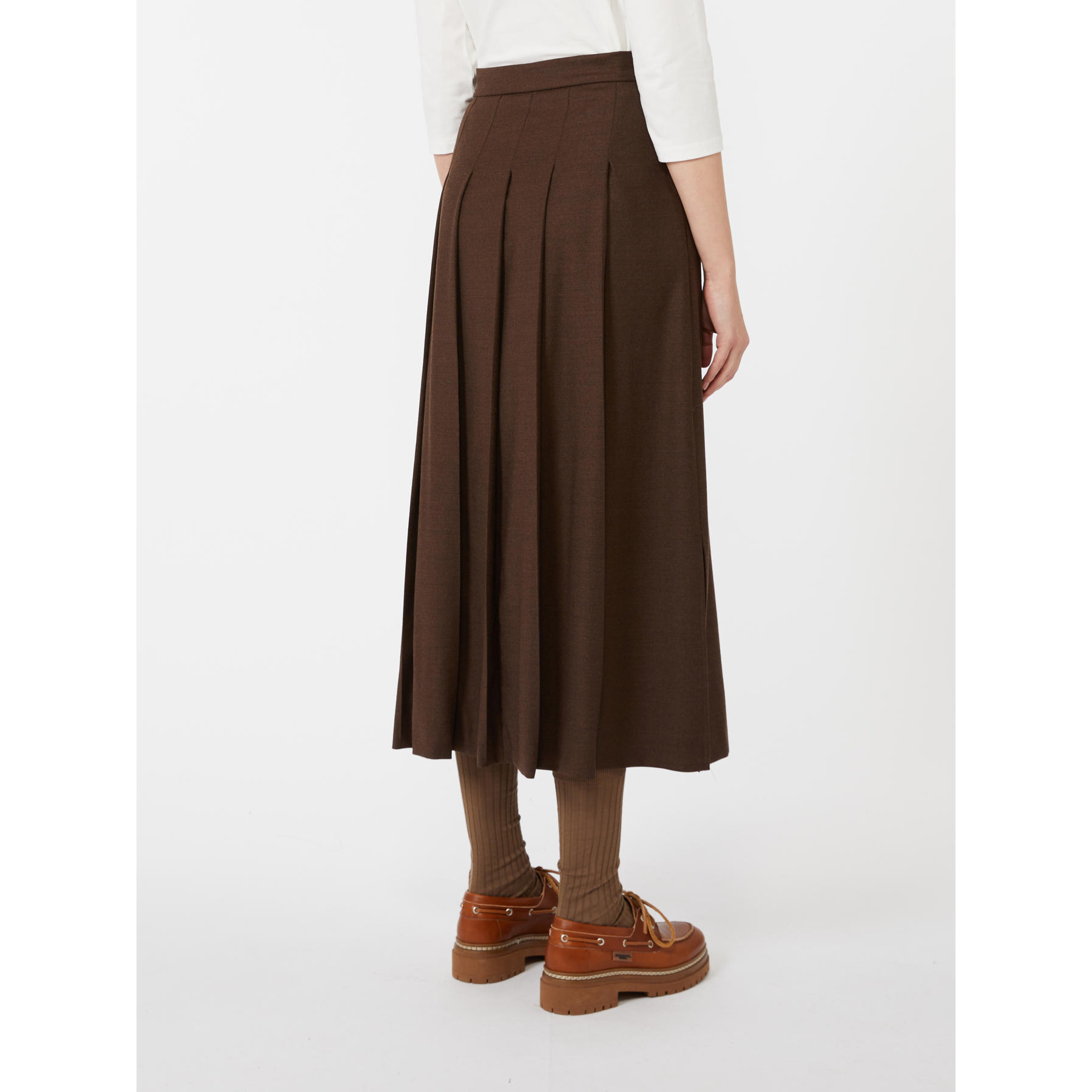 Long skirt with a wrap-around silhouette and pleated motif mounted on the front and back.