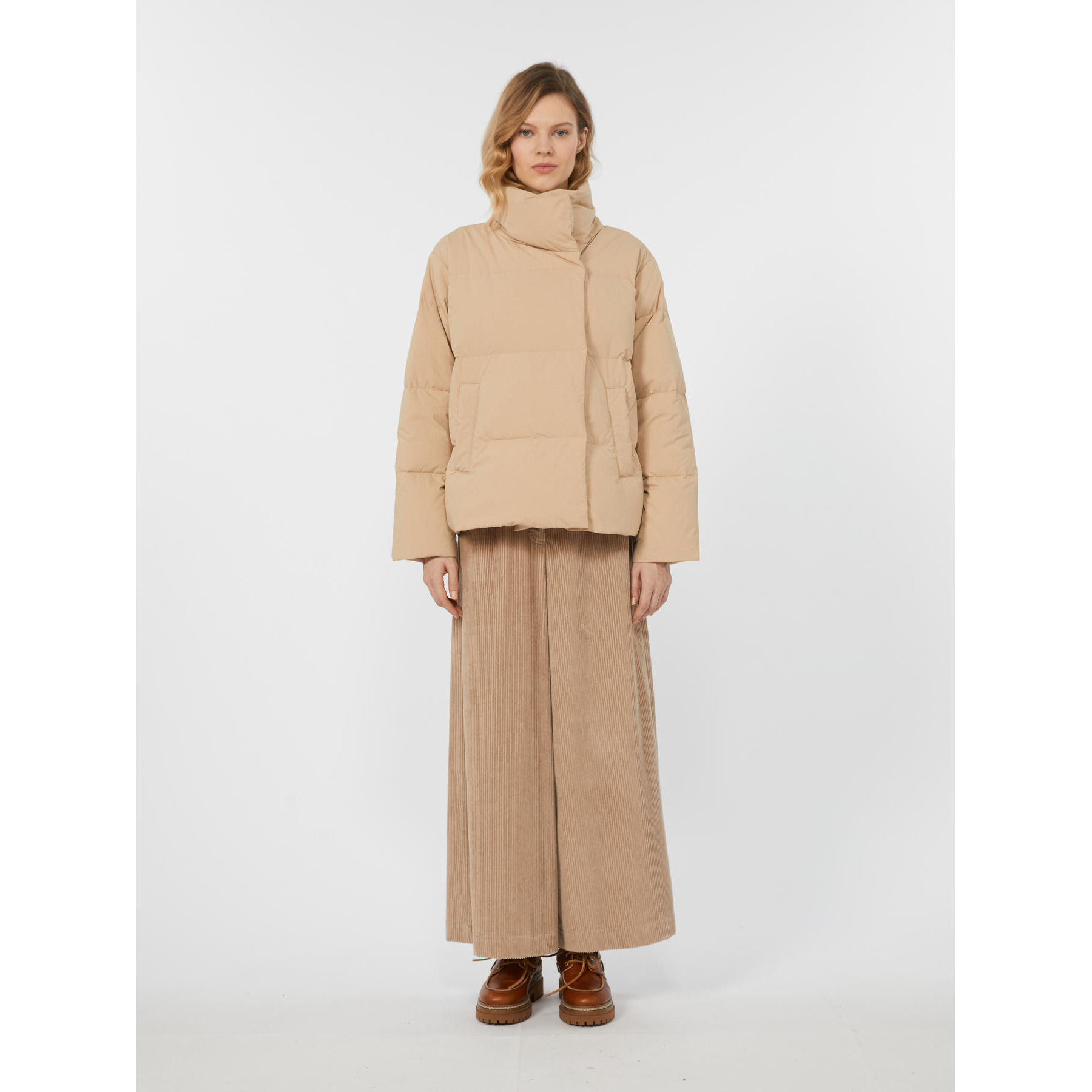 Goose down jacket with cropped waist and all-over quilted pattern.