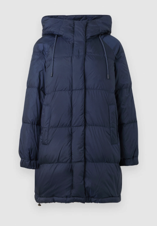 Midi parka with drawstring hood and quilted horizontal stripe pattern.