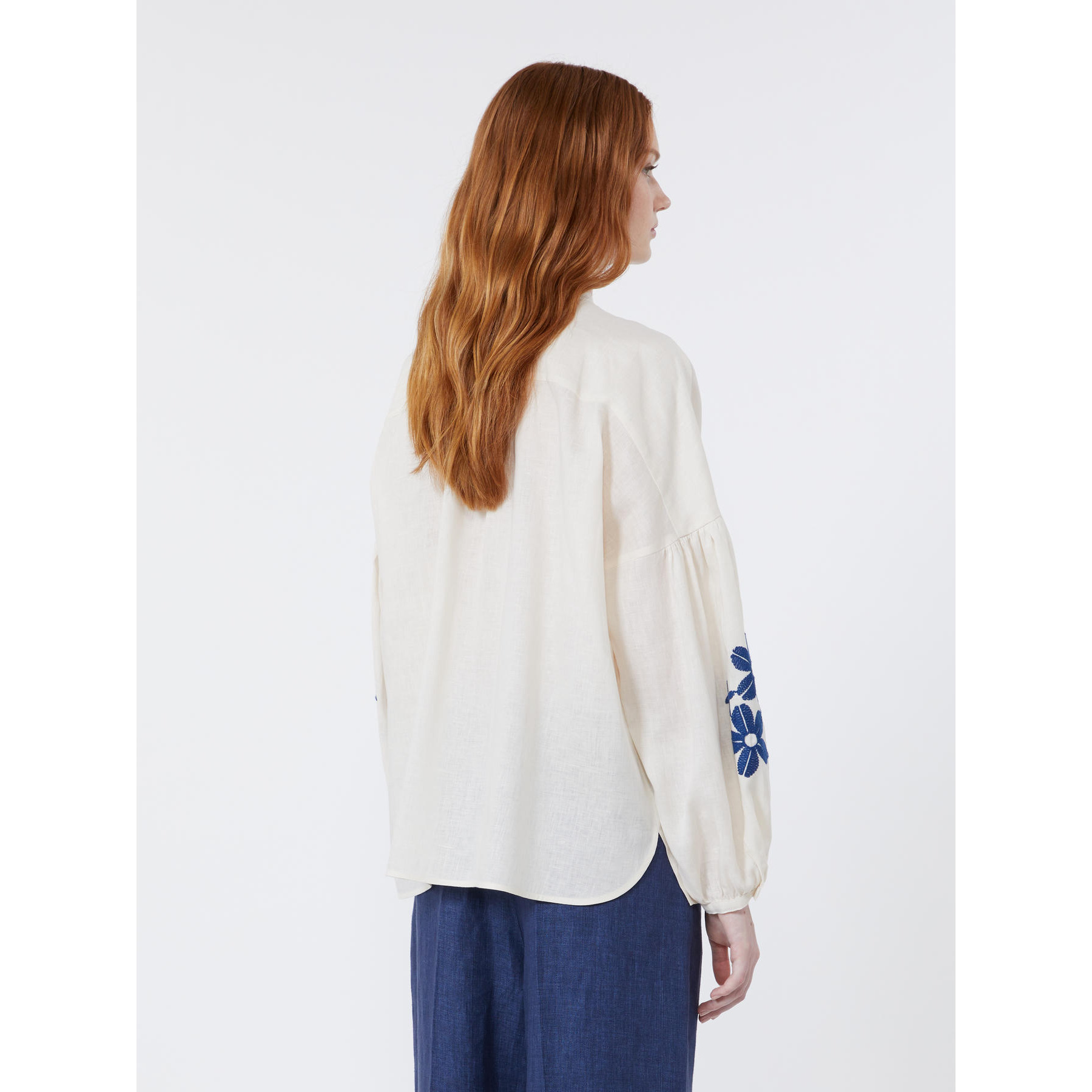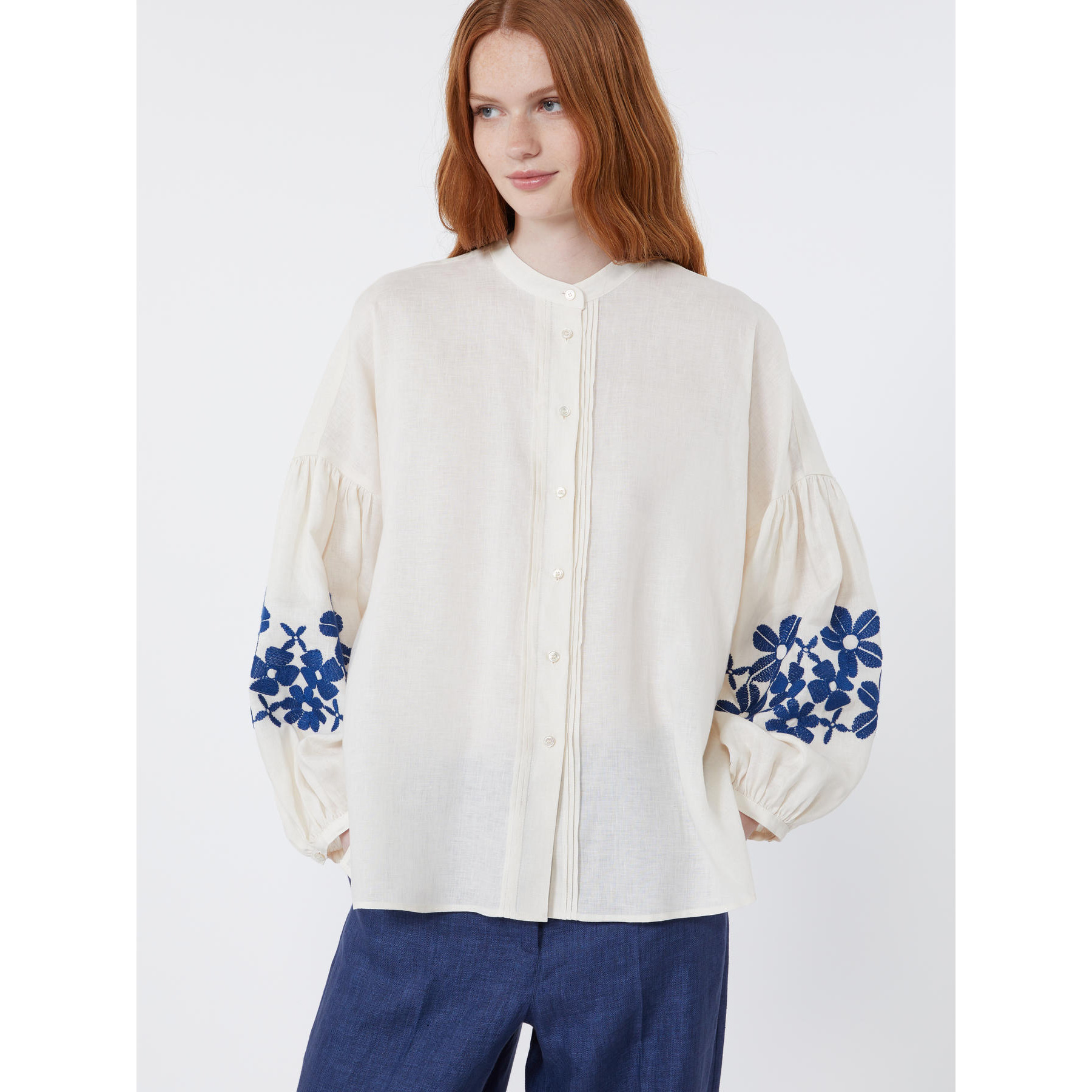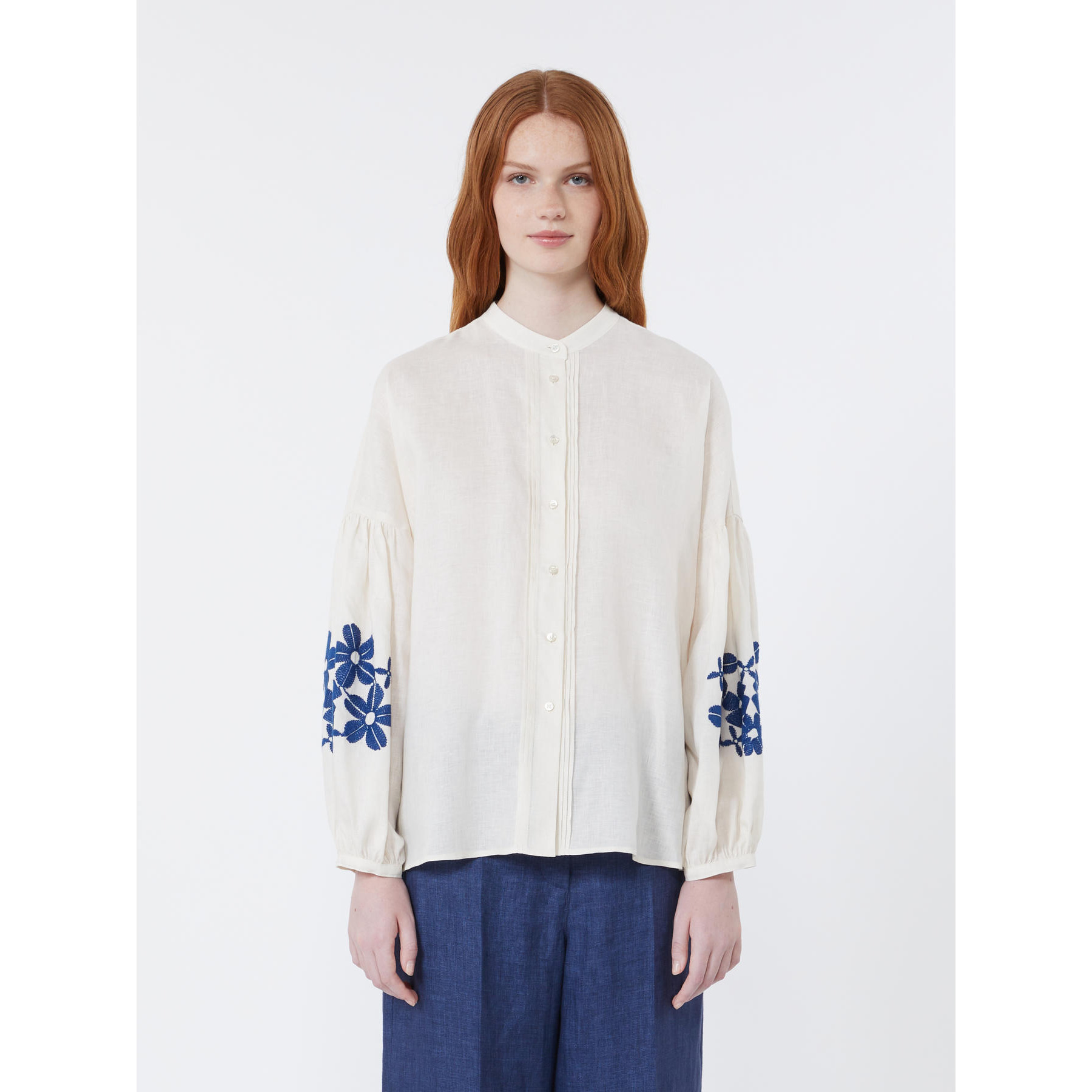 Pure linen shirt with mandarin collar, long sleeves, side slits, and a back yoke. Embroidered motifs and gathered details enhance the piece. Button closure. Loose fit.