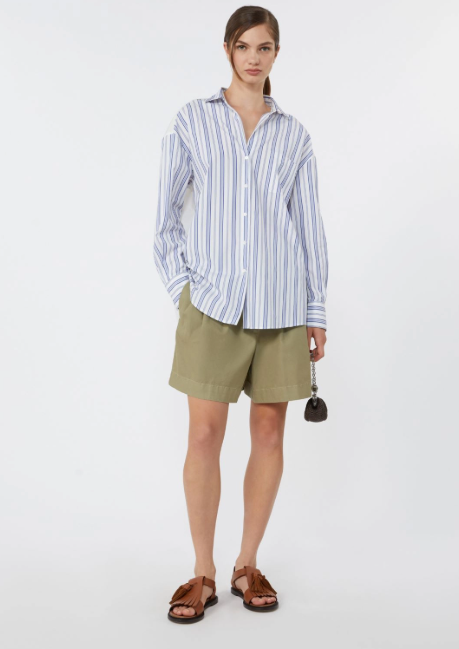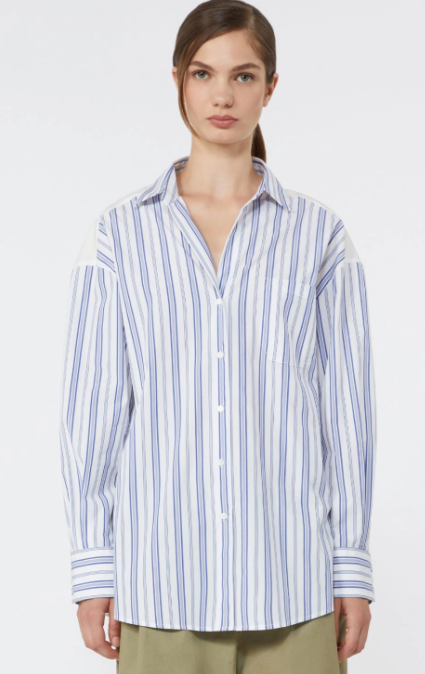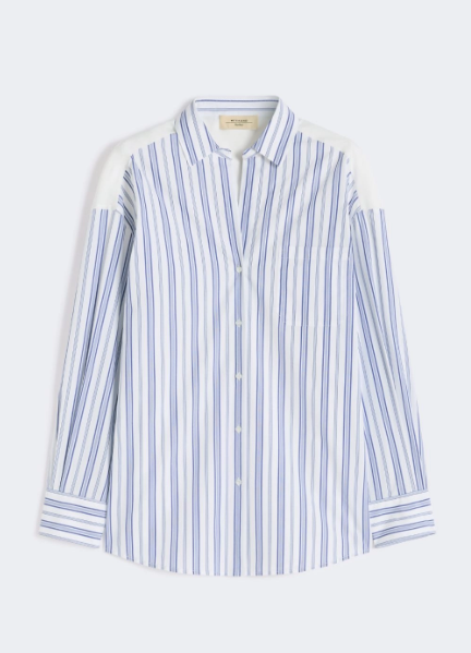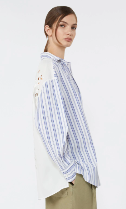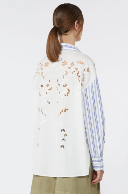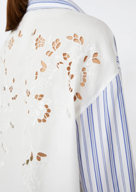 Pure cotton poplin shirt with a collar and V-neck, long low-cut sleeves, a patch pocket on the chest, and side slits. The contrasting insert with broderie anglaise embroidery on the back adds character. Button closure. Relaxed fit.