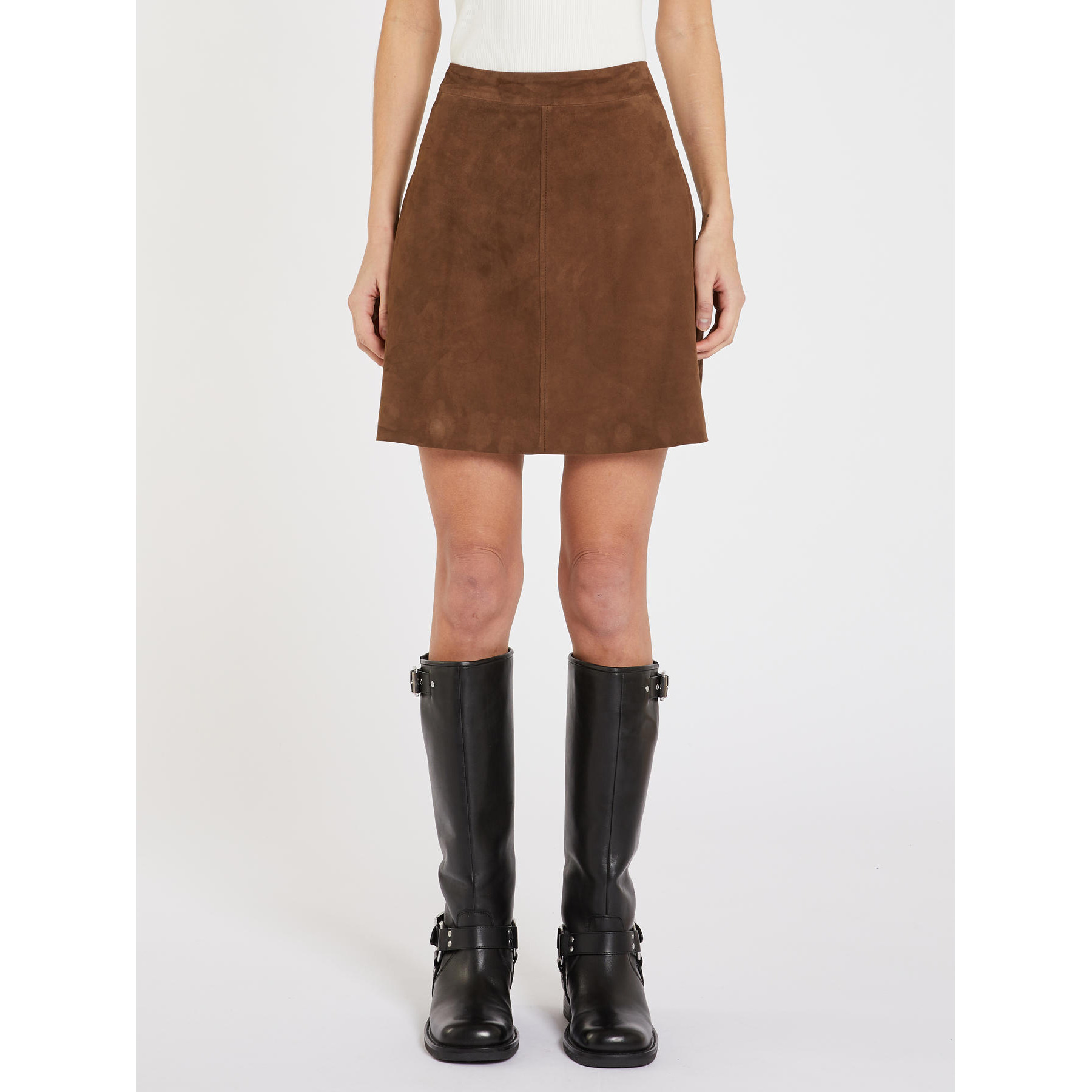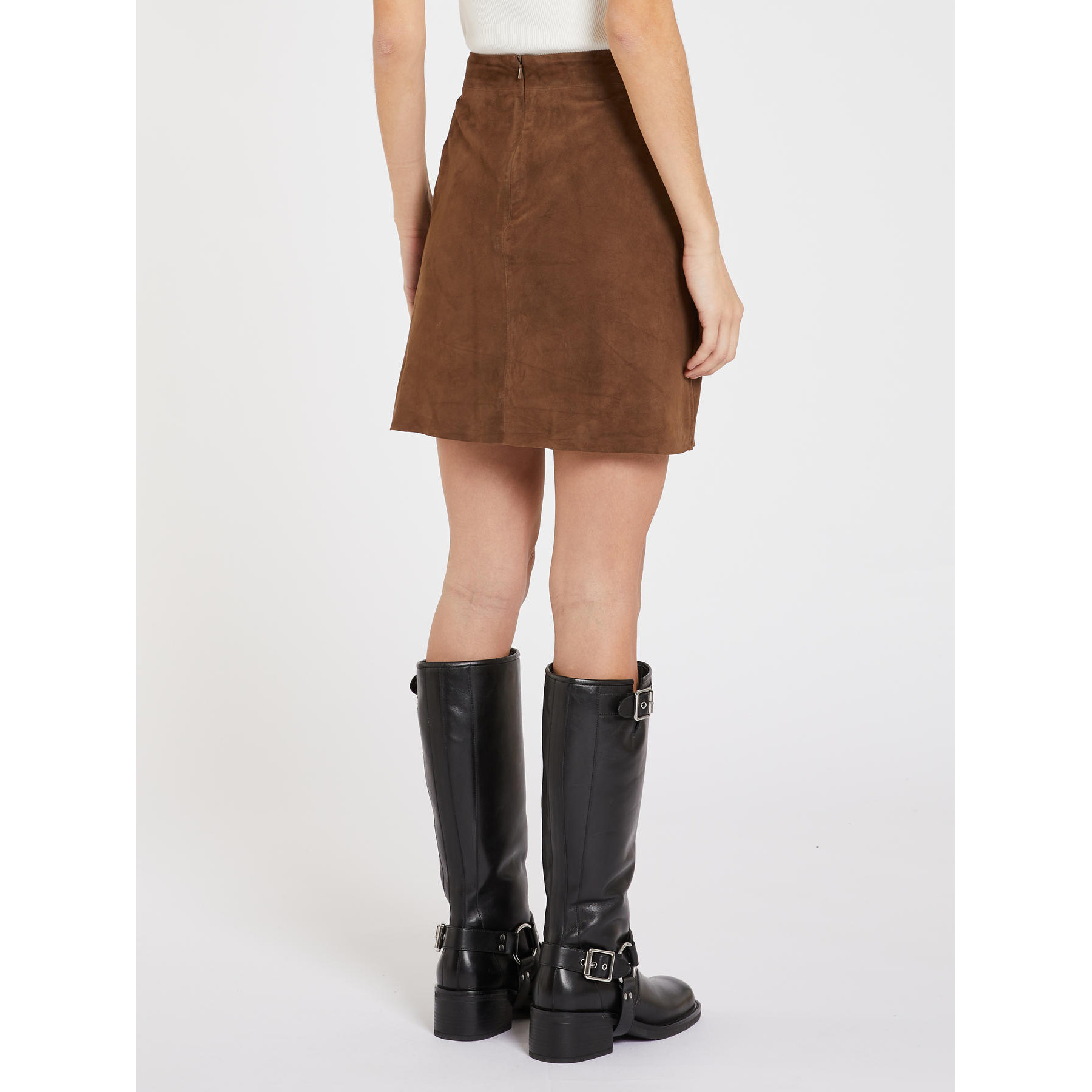 Grintosa e sofisticata, la mini gonna in suede carezza i fianchi e lascia scoperte le gambe, in un gioco di seduzione da completare con slingback e giacchino coordinato.