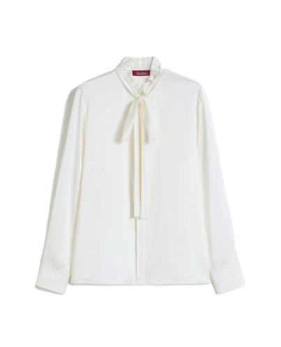 Una blusa femminile con colletto a gorgera. Il design è ulteriormente impreziosito da rouches decorative e lacci frontali da annodare a fiocco. Blusa in raso di seta Linea dritta e fluida Colletto a gorgera Maniche lunghe a giro Chiusura frontale nascosta Polsini alti con doppio bottone