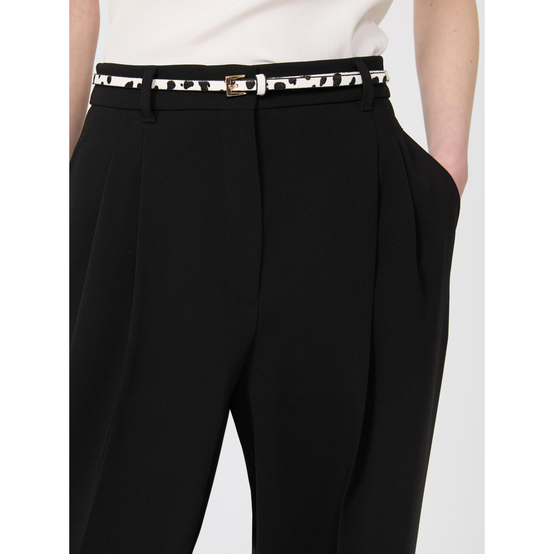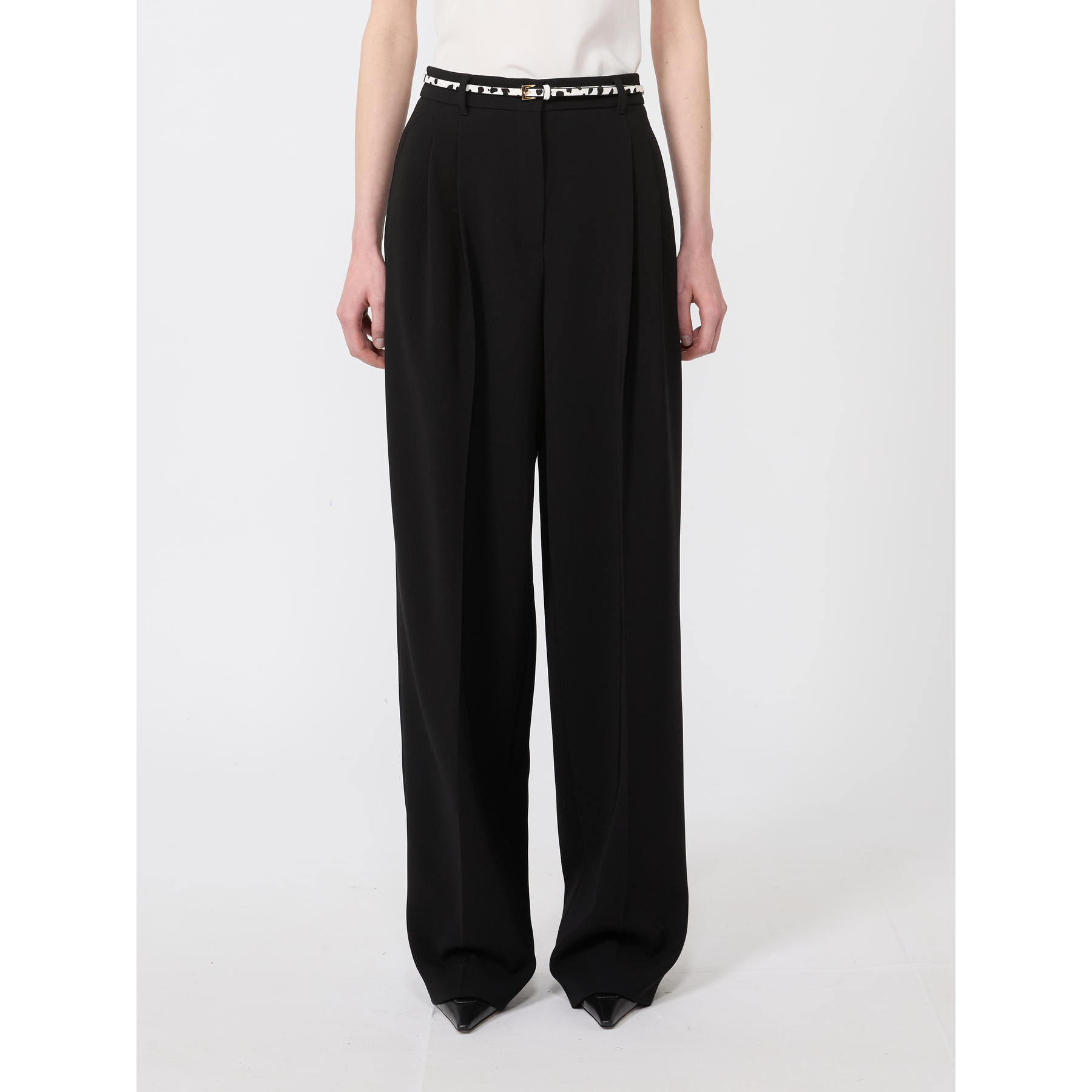 Pantalone a vita alta, caratterizzato da una silhouette fluida con doppia pinces sul davanti, di cui una sfumata. Pantalone in cady