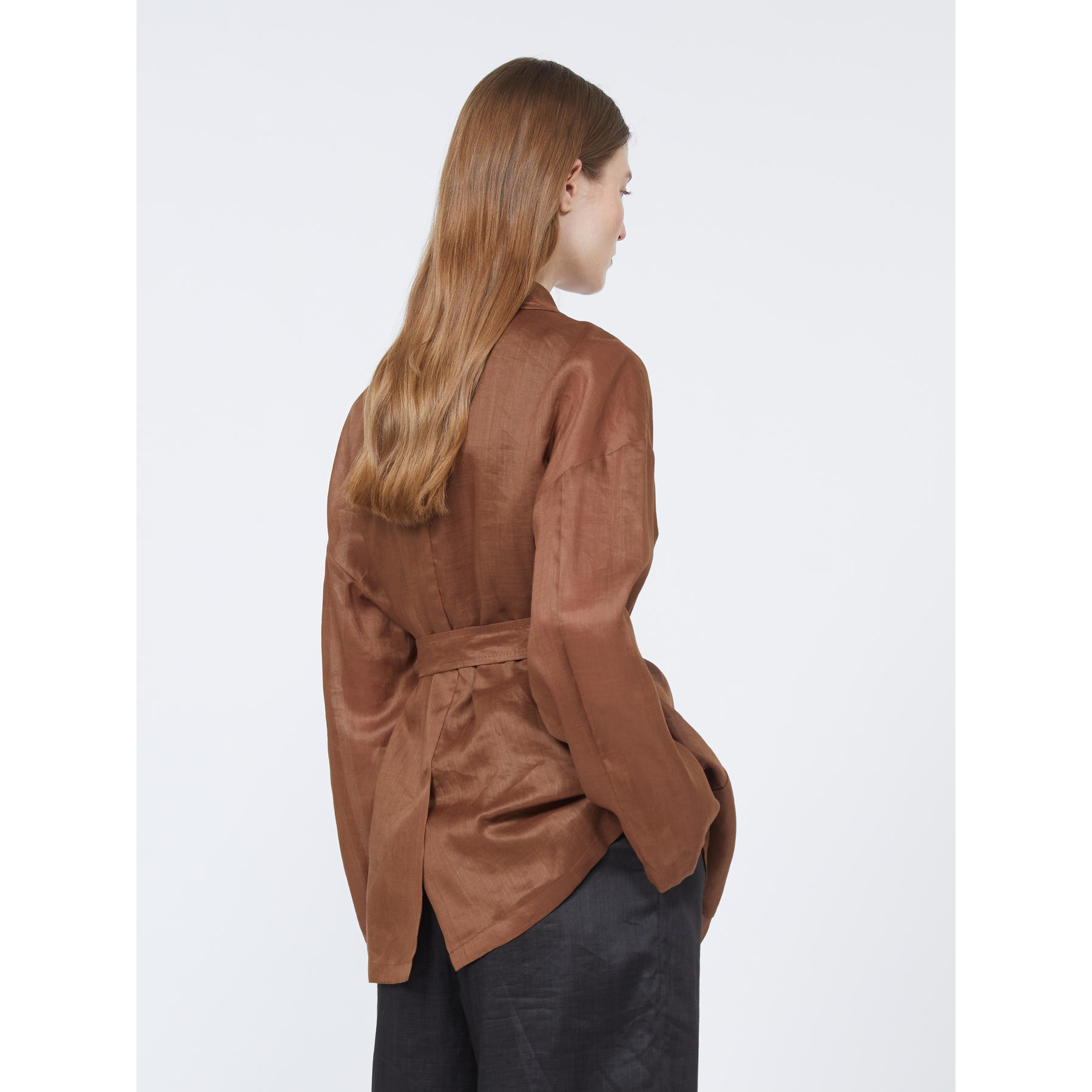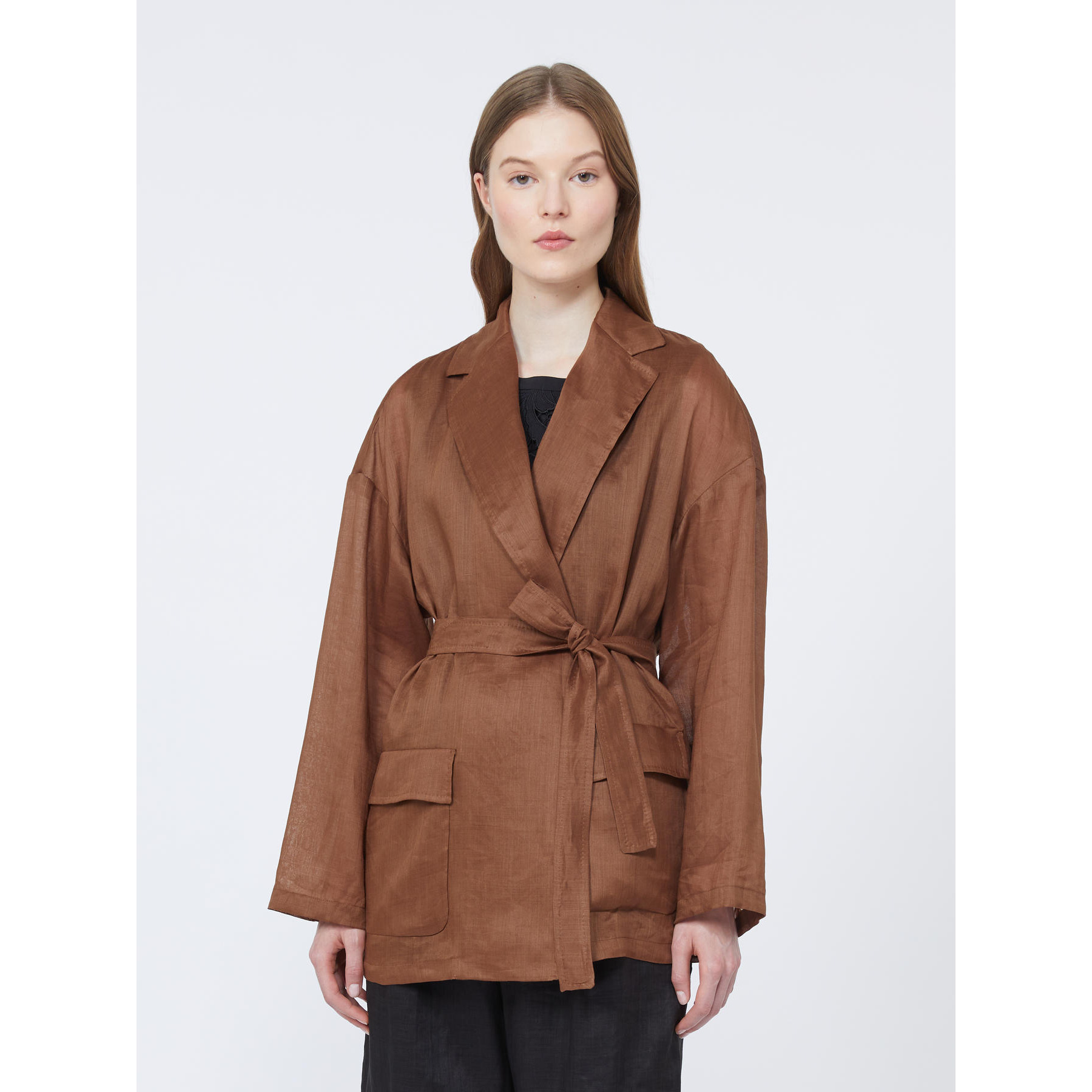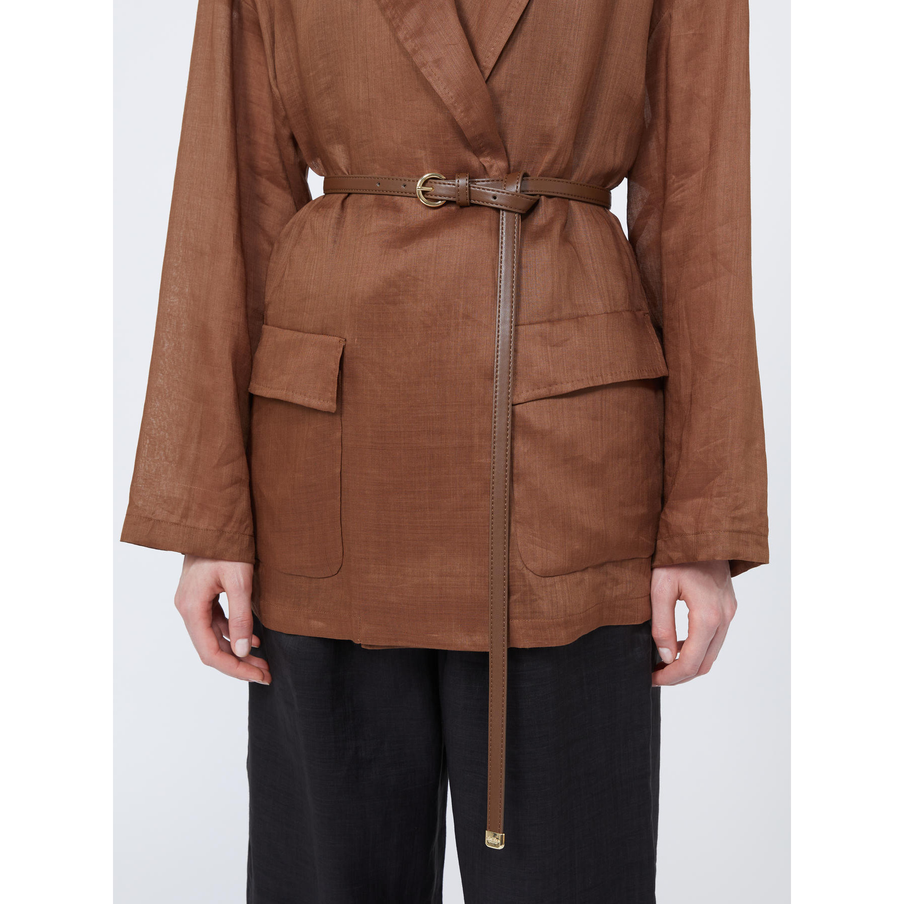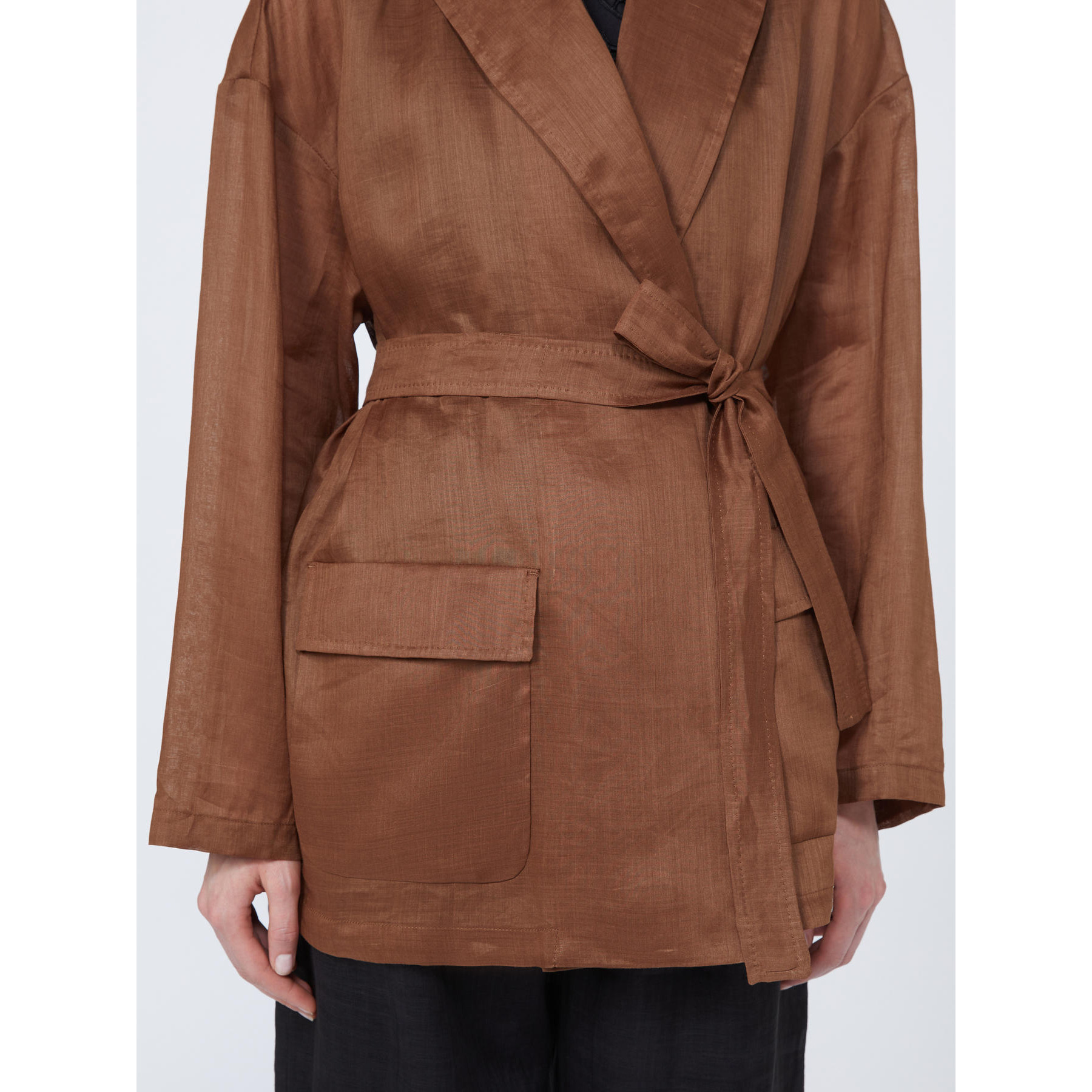 Giacca dalla silhouette a vestaglia, completa di due cinture abbinate: una in tessuto coordinato e una in tessuto spalmato.