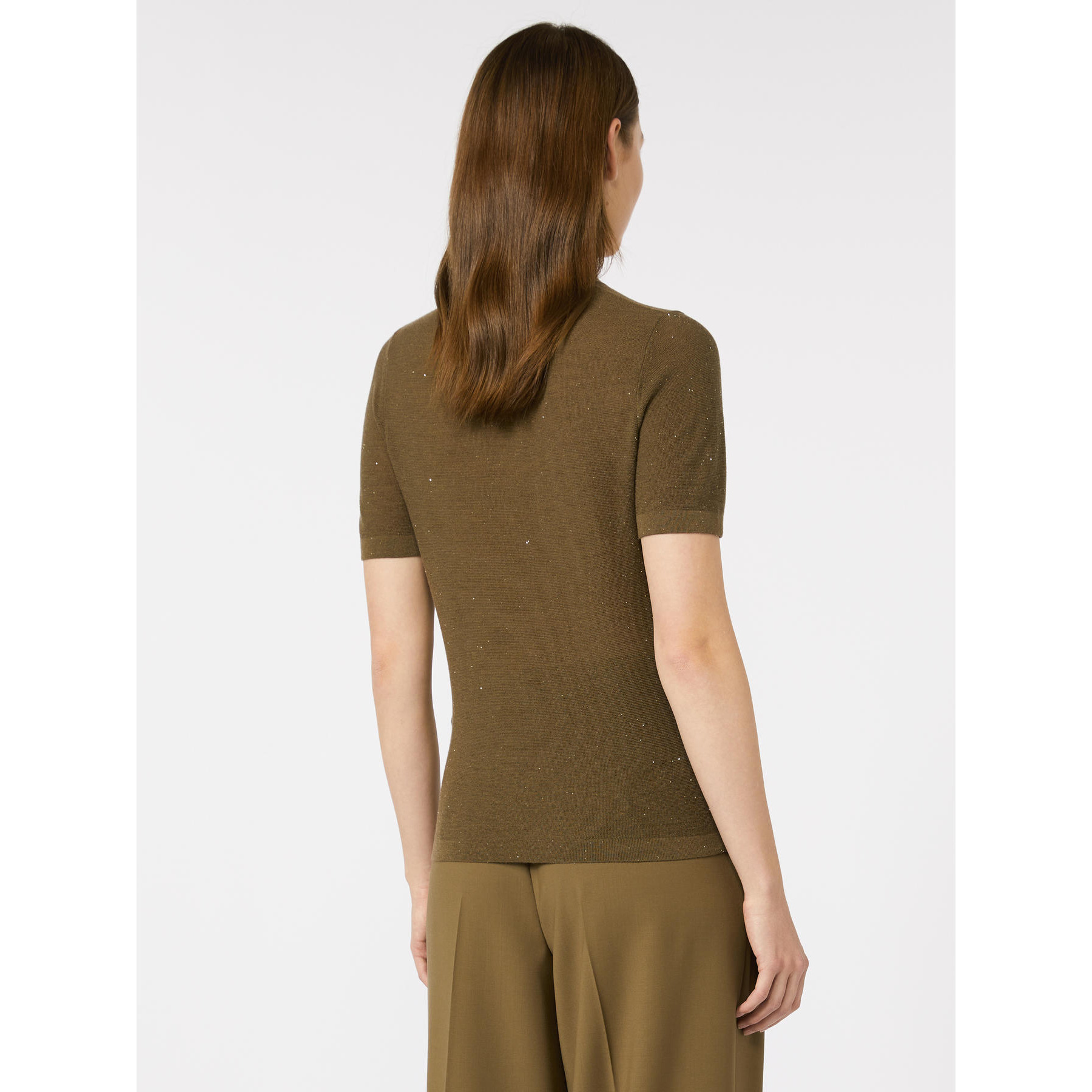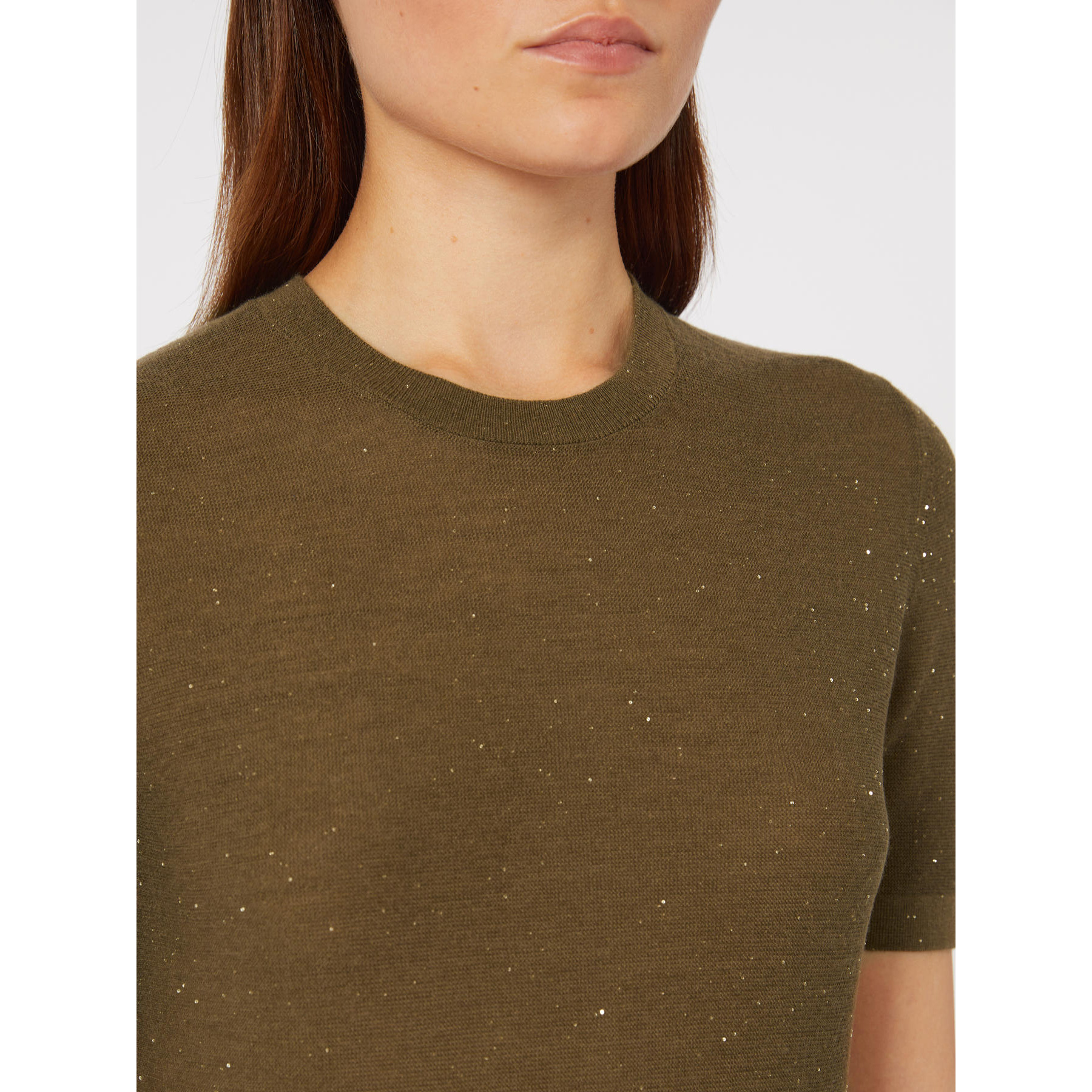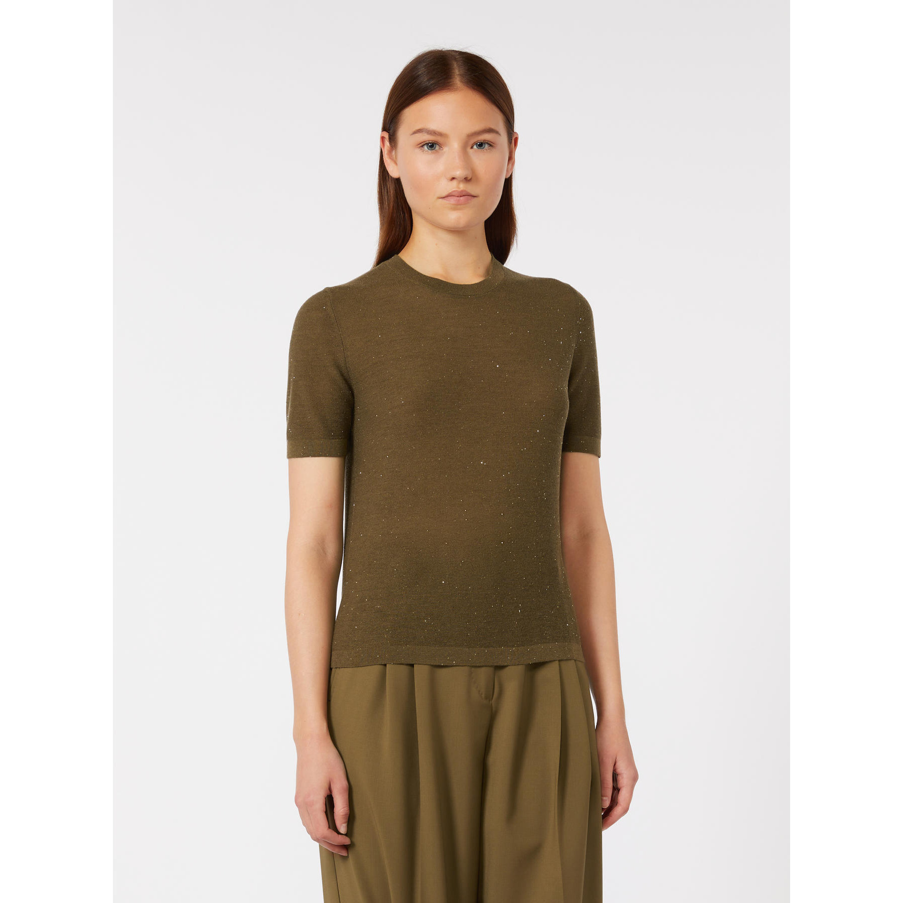 Maglia girocollo impreziosita da micro paillette ricamate all over. Maglia in filato di lana e seta, lavorato a punto links