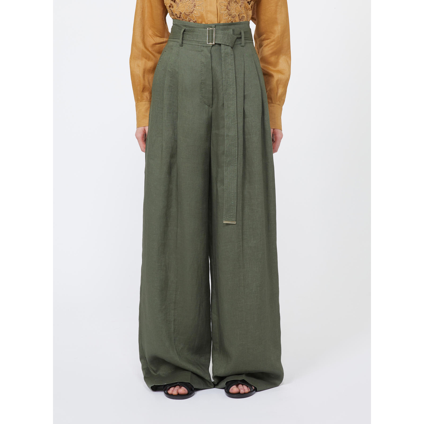 Pantalone wide leg a vita alta dalla linea leggermente oversize.