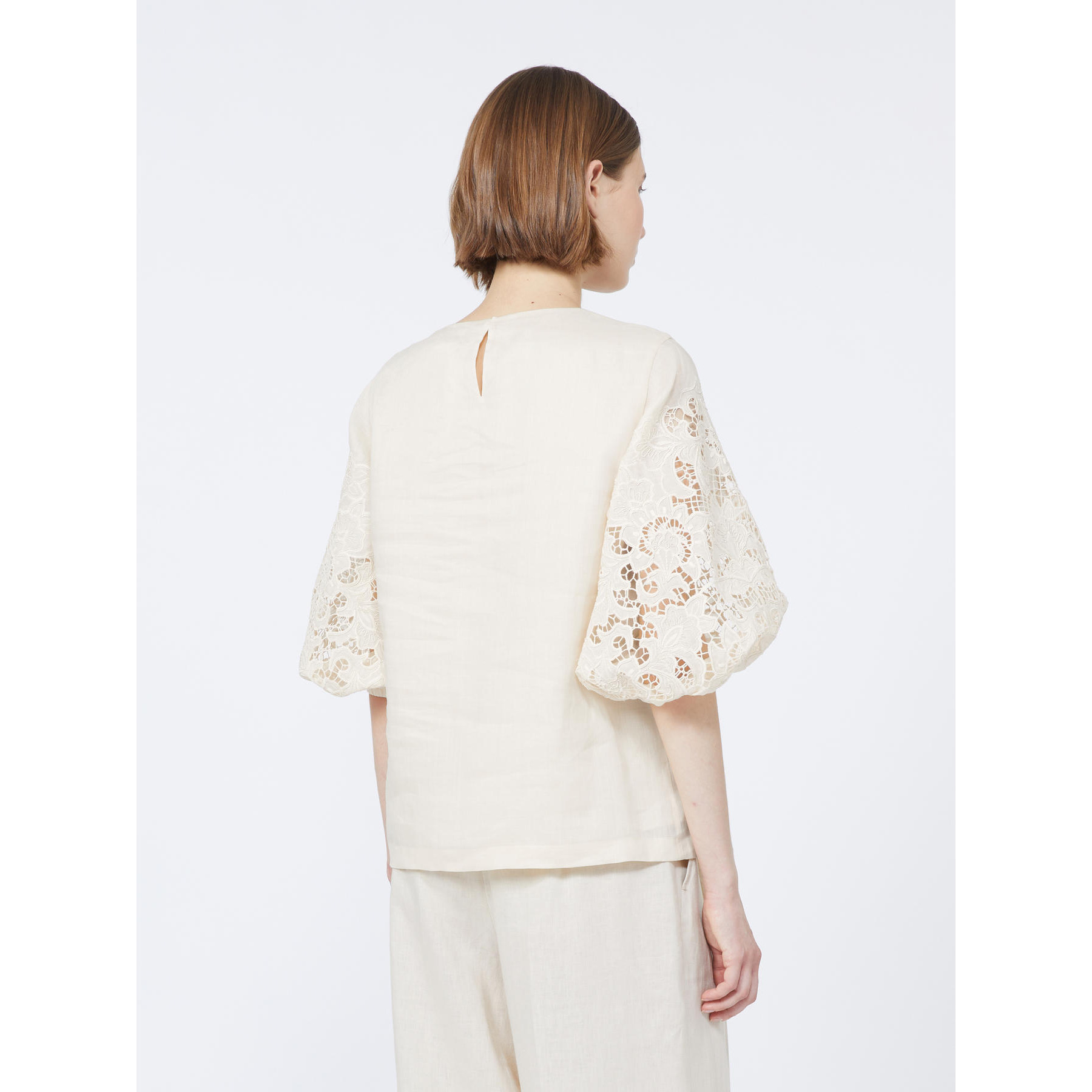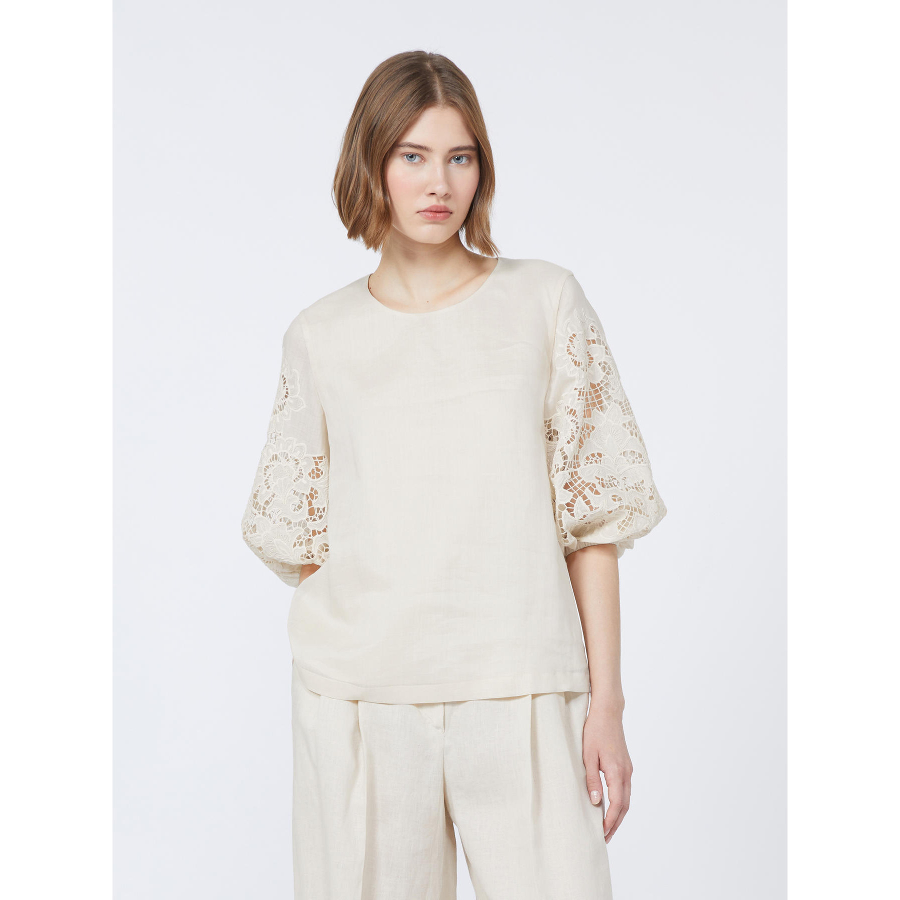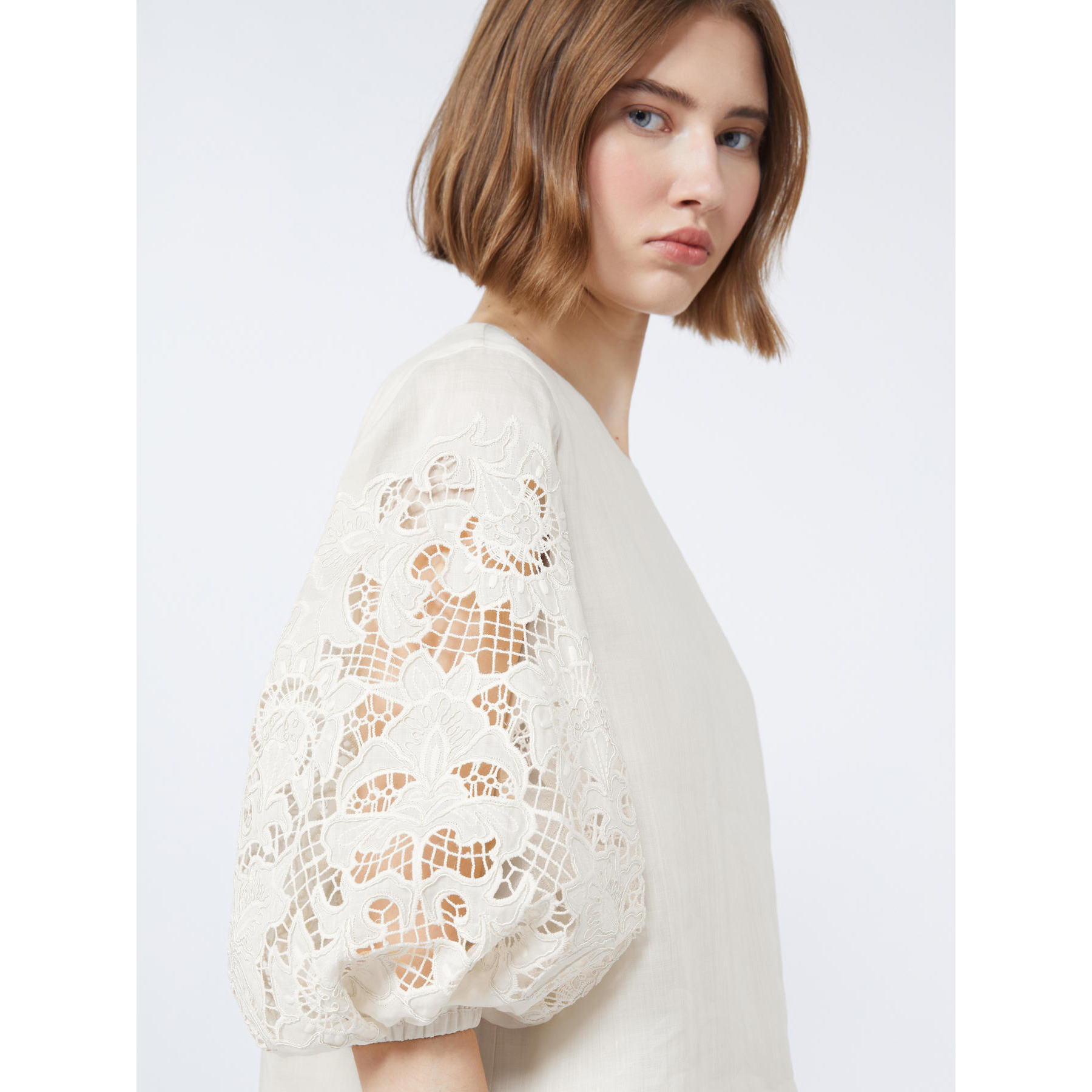 T-shirt con maniche a lanterna in macramè, impreziosita da ricamo Sangallo.