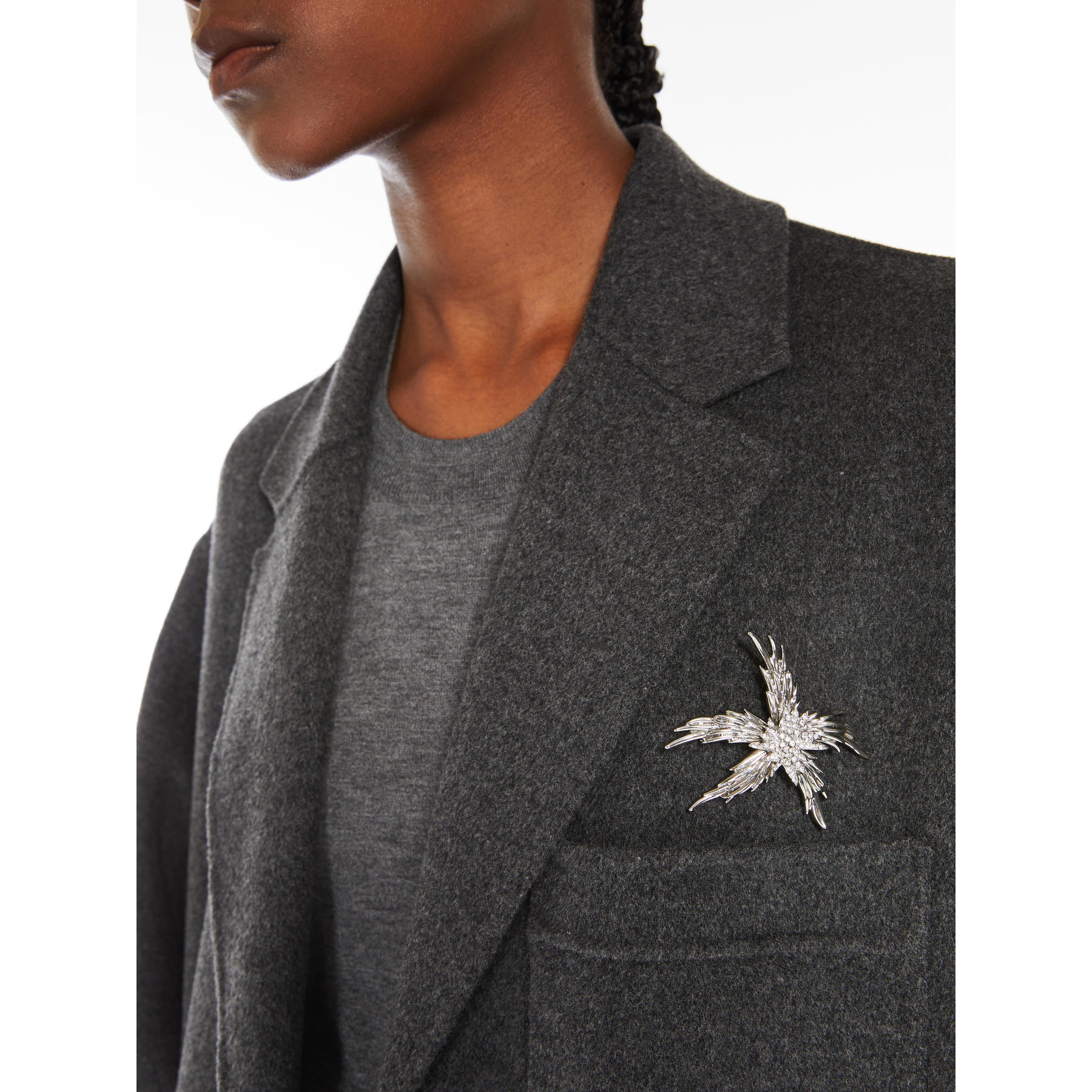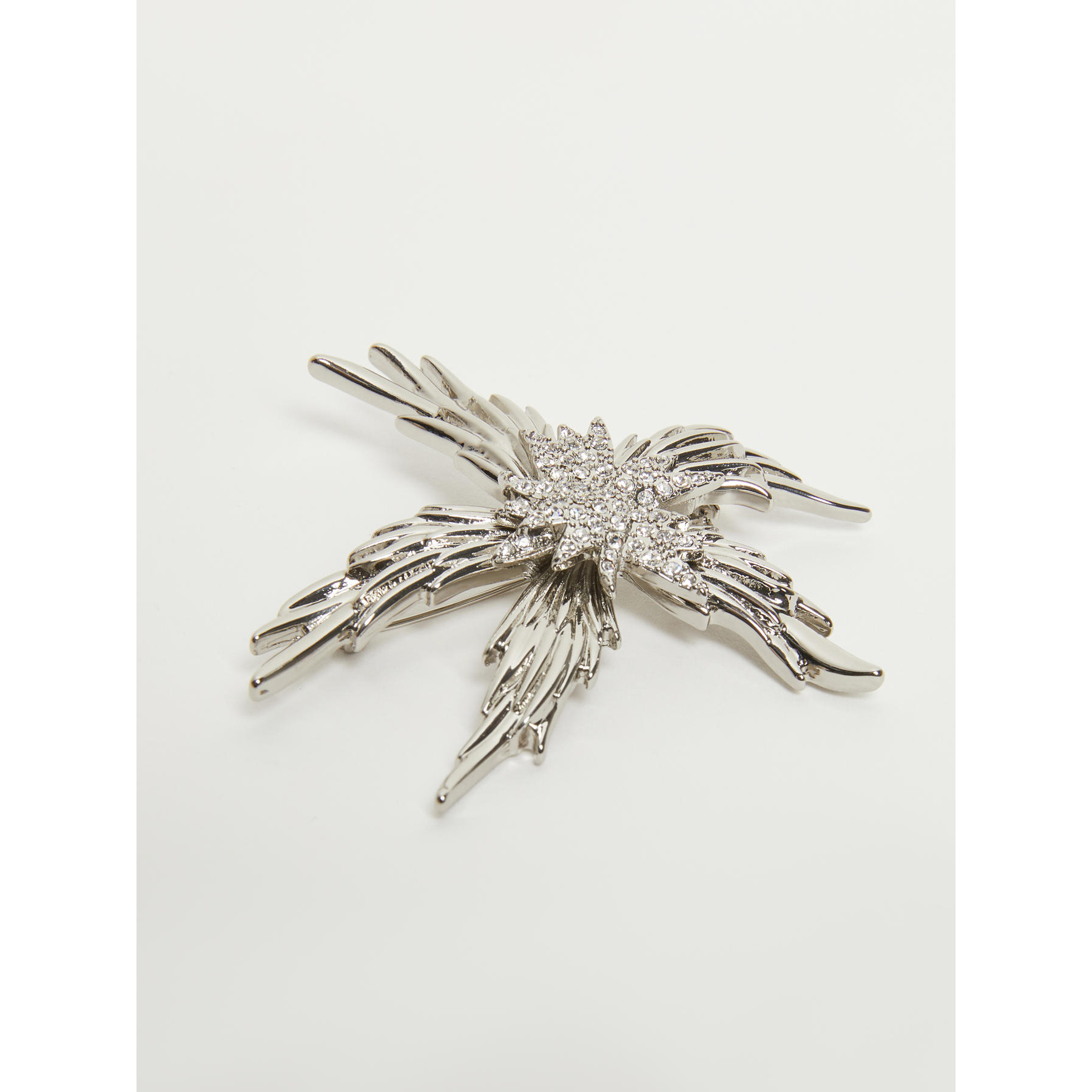 Spilla in metallo smaltato, impreziosita da cristalli applicati e dettagli in finitura dorata. Chiusura con gancio sul retro.