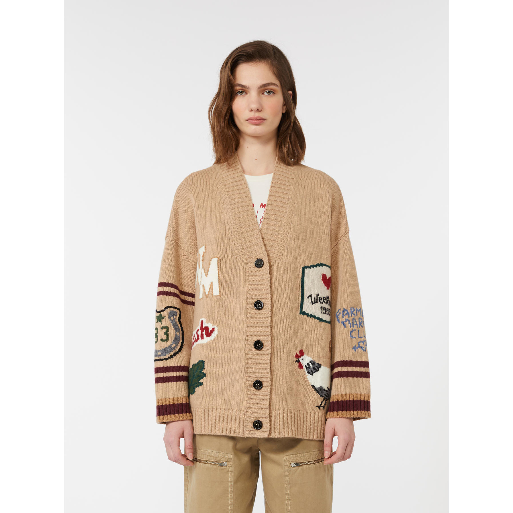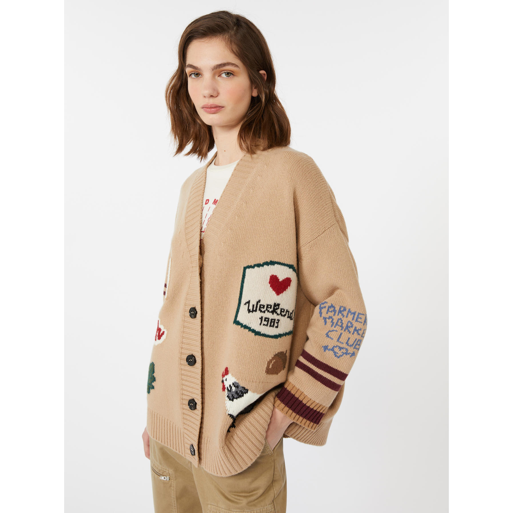 Cardigan overfit, impreziosito da una lavorazione ad intarsio con disegni sul davanti e le maniche.