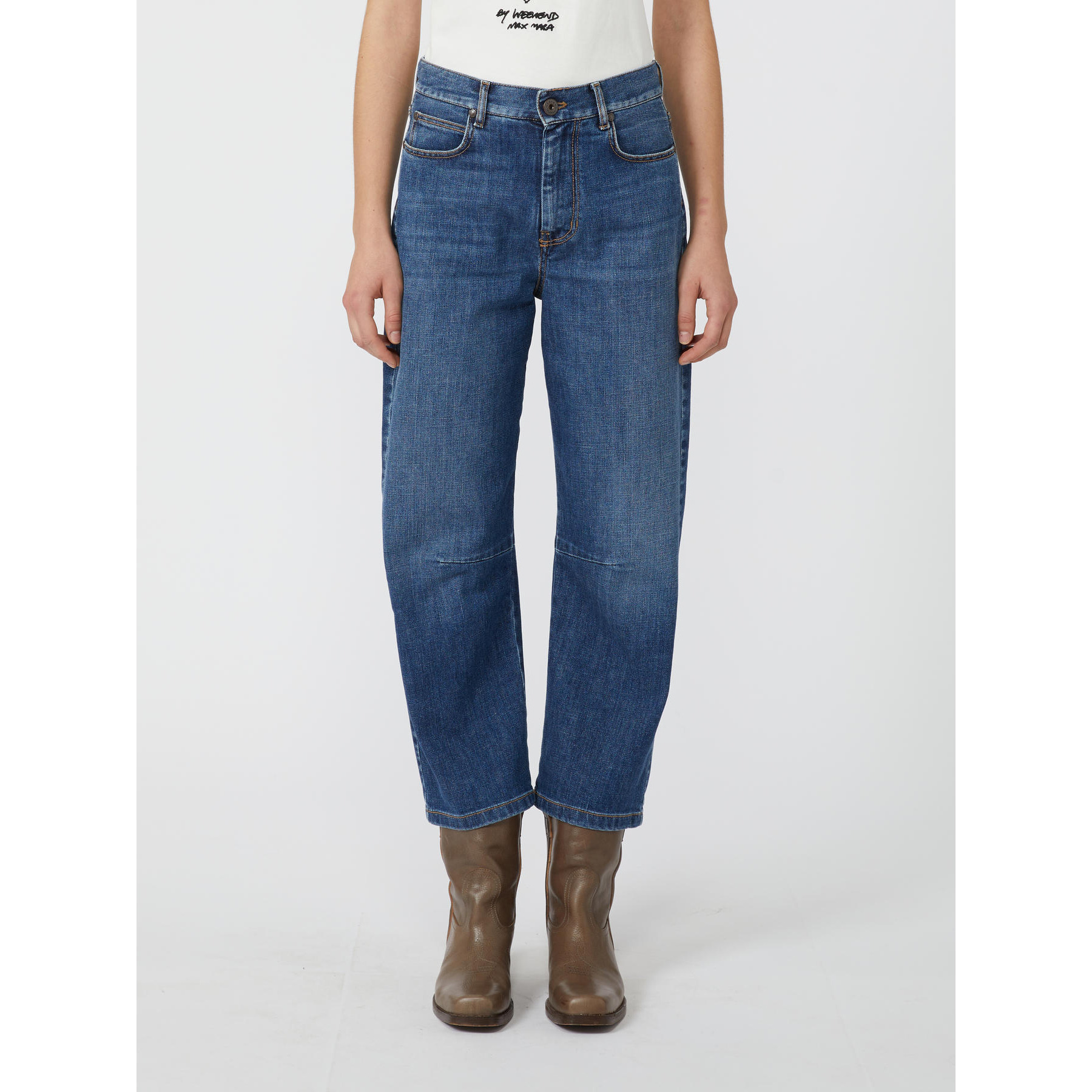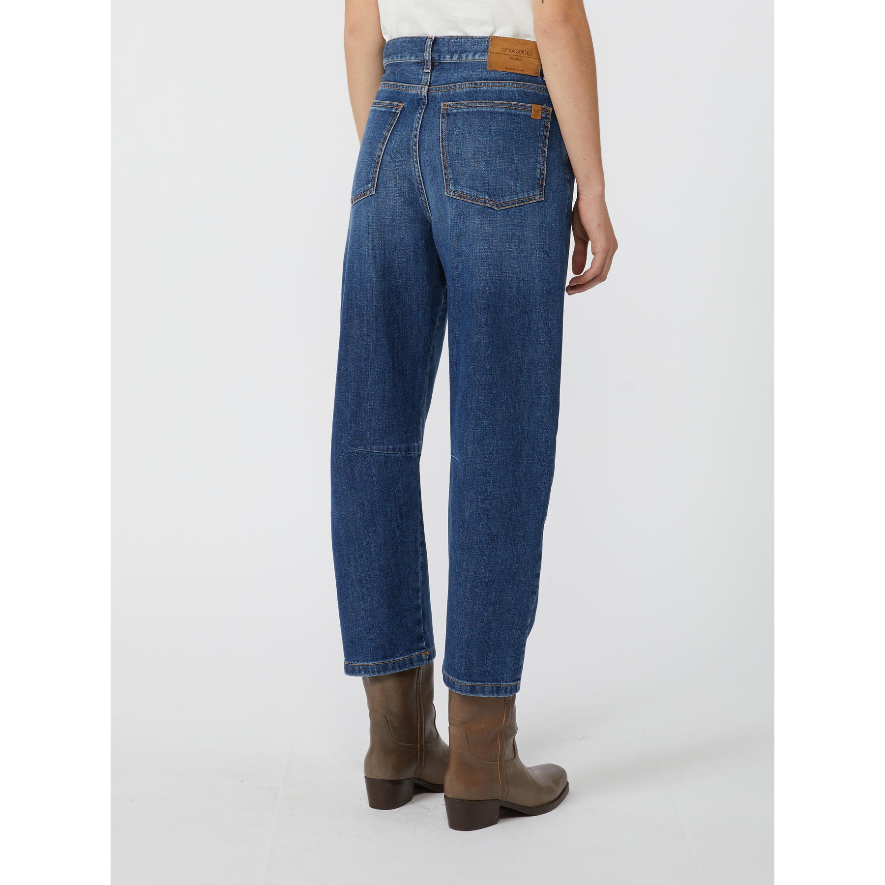 Jeans barrel leg con motivo di pinces cucite interne, all'altezza del ginocchio.