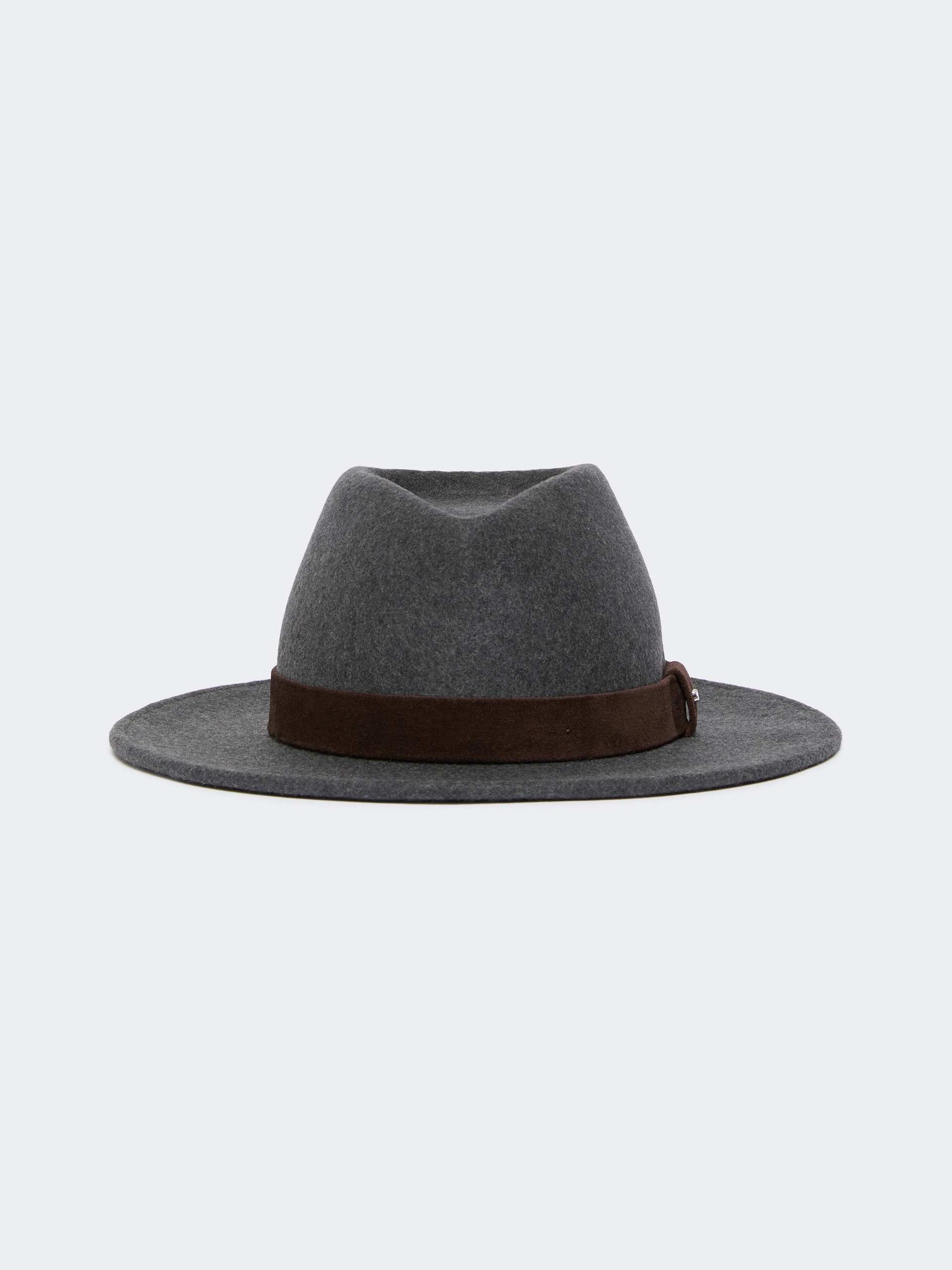 Cappello modello fedora, rifinito da nastro in pelle scamosciata e borchia a farfalla in metallo sulla corona.
