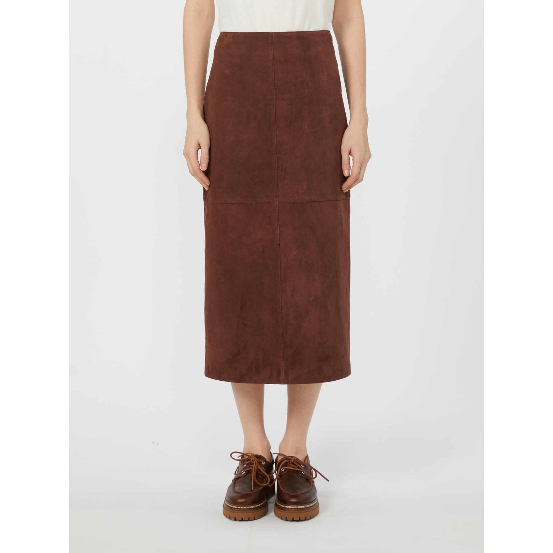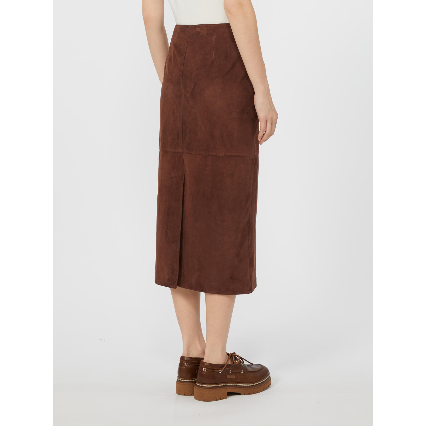 Gonna midi dalla silhouette dritta, rifinita con tagli e impunture stile pelletteria.