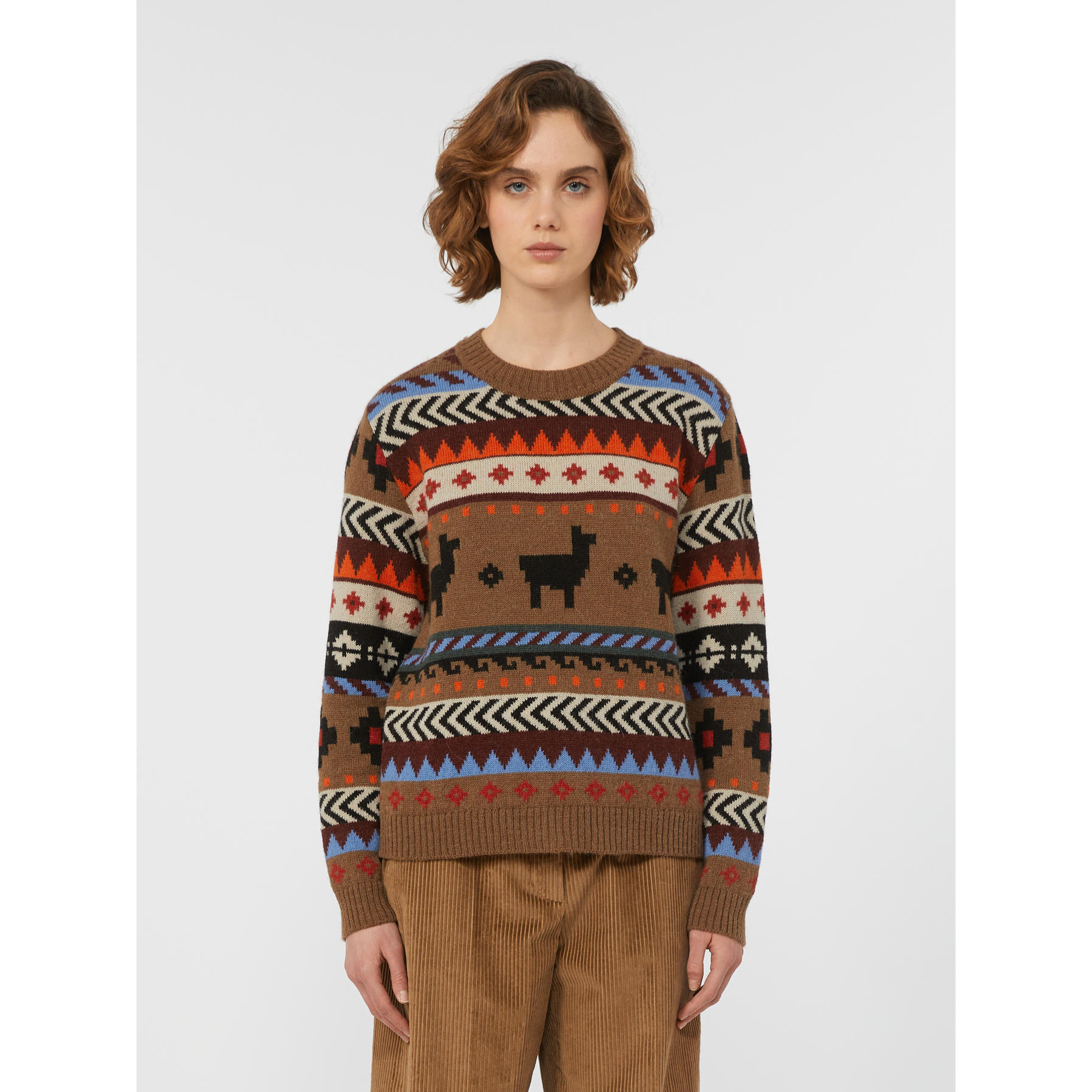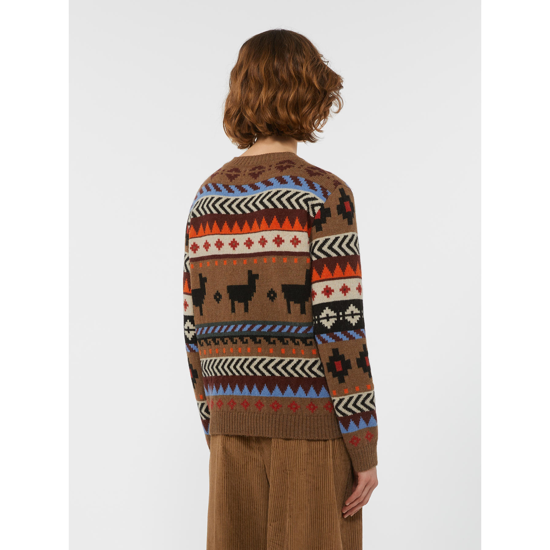 Maglia girocollo, caratterizzata da una lavorazione jacquard che disegna all over una fantasia a contrasto.