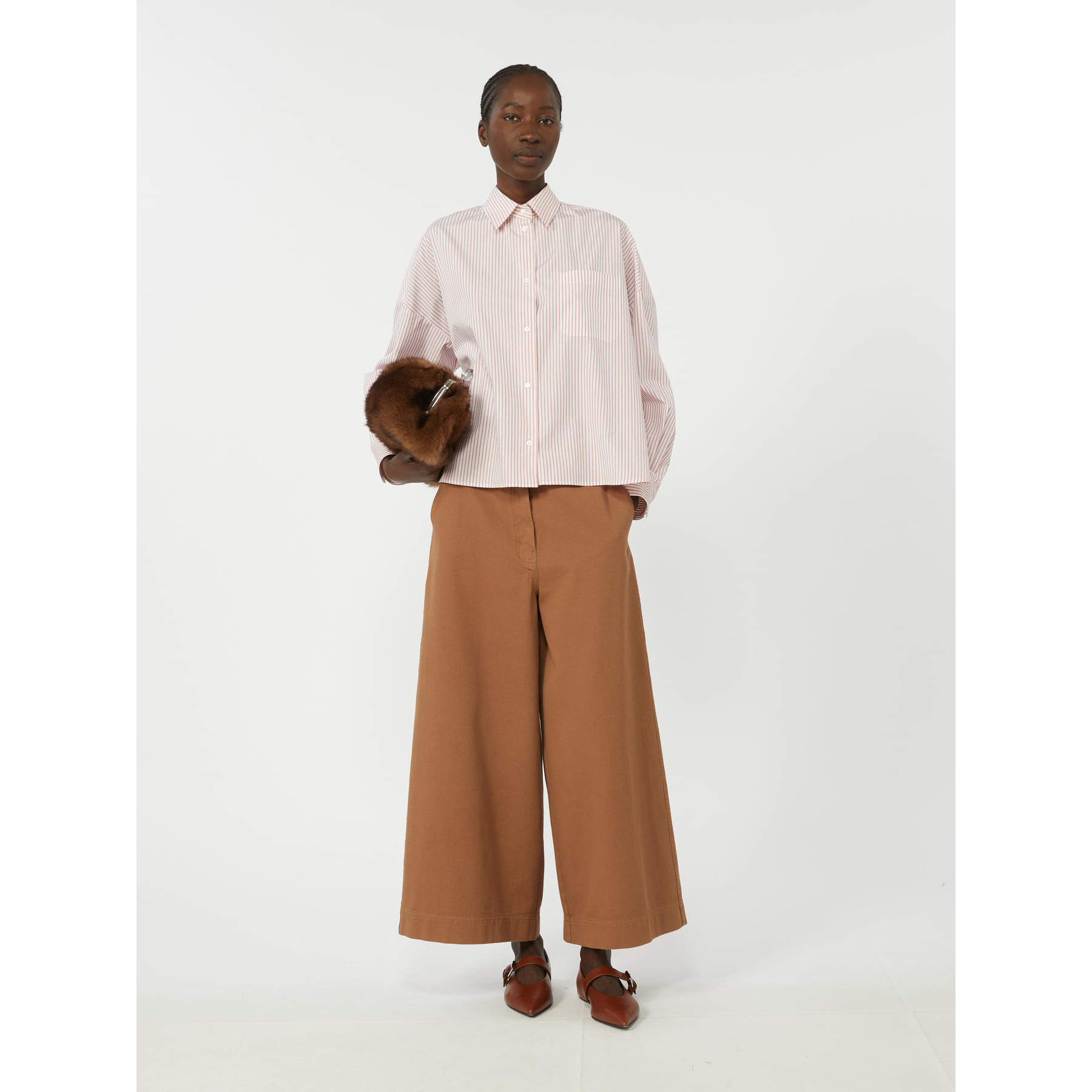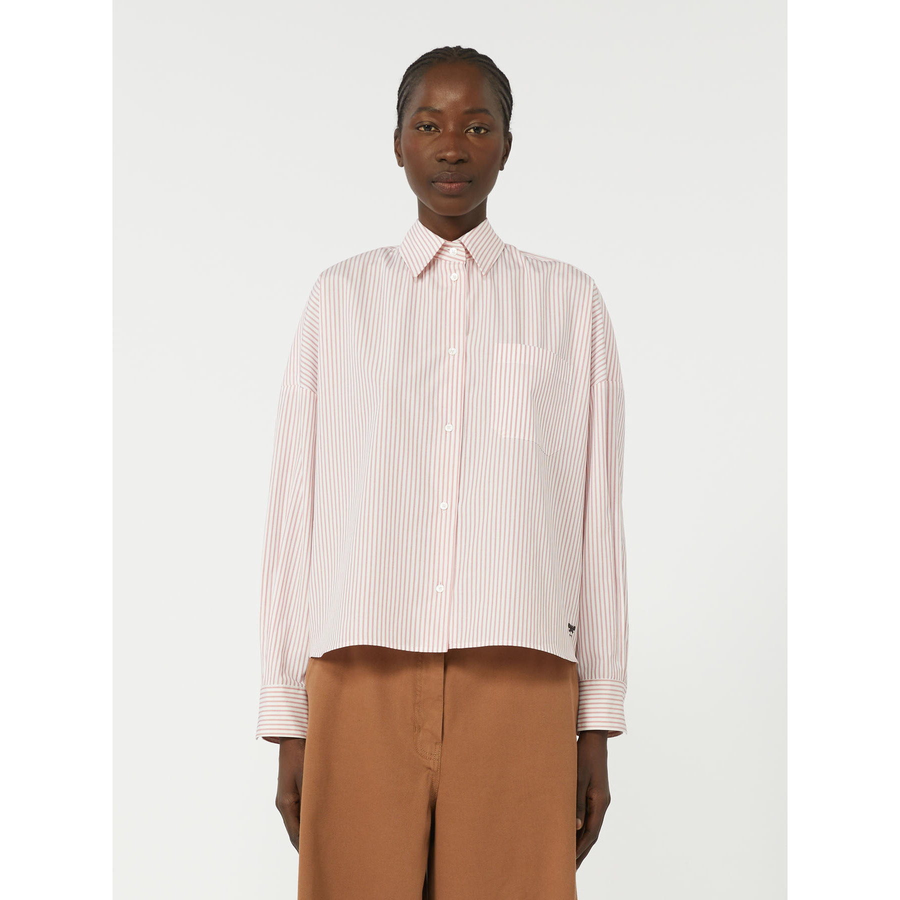 Camicia oversize con piccolo logo a farfalla ricamato al fondo davanti.