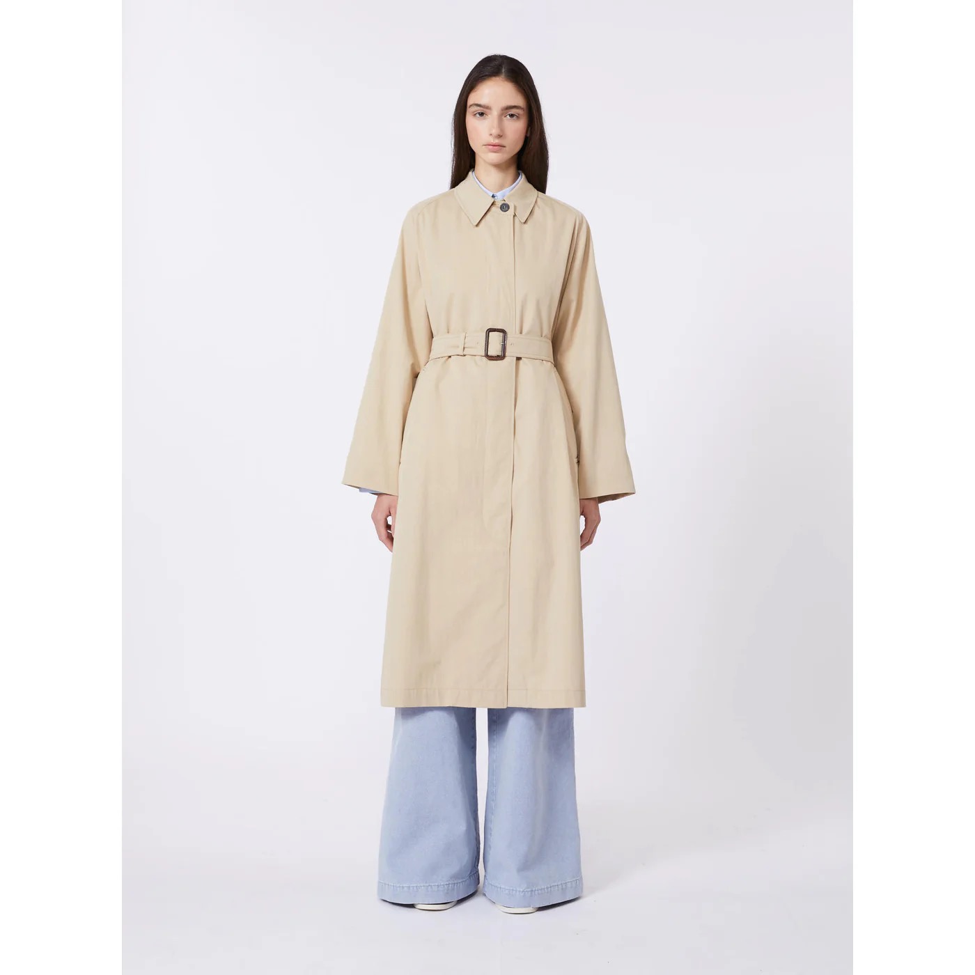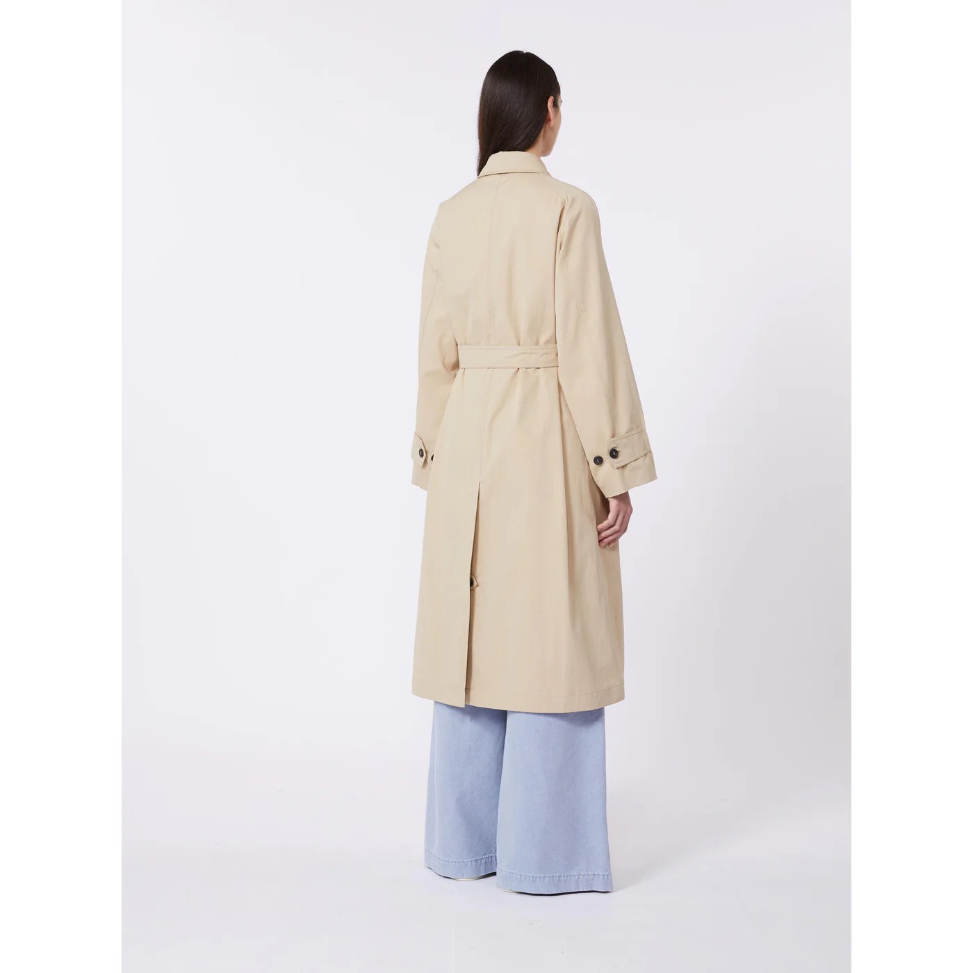 Trench midi dalla linea svasata con cintura abbinata in vita per evidenziare la silhouette.