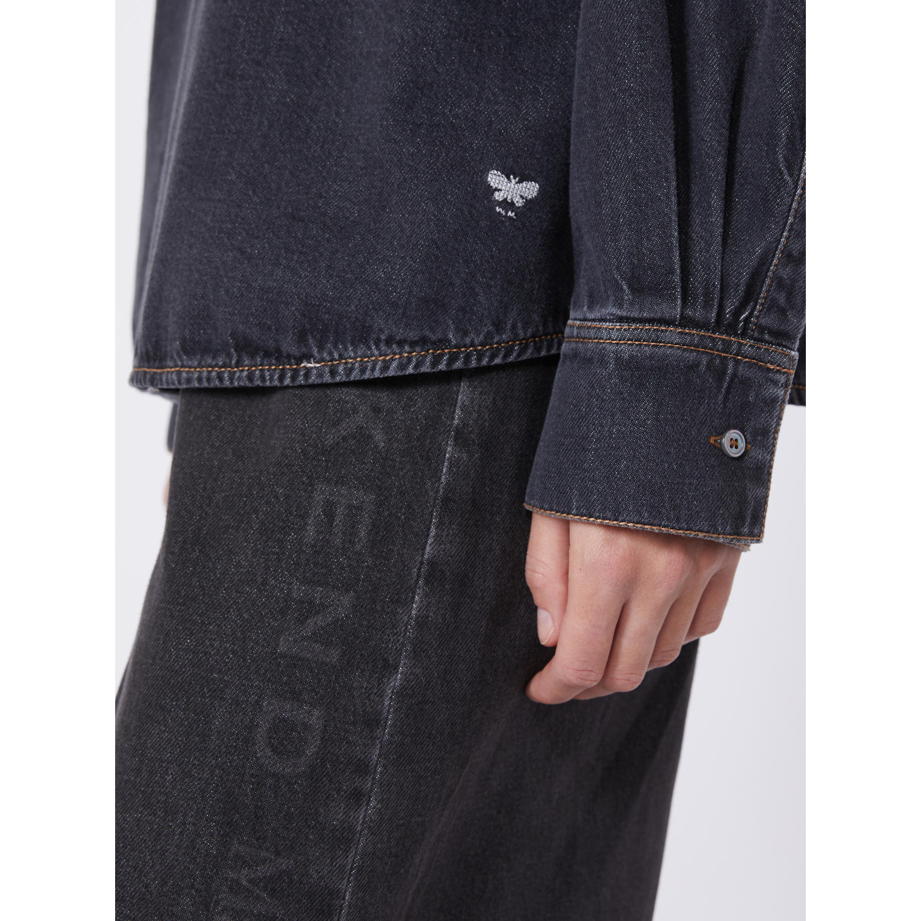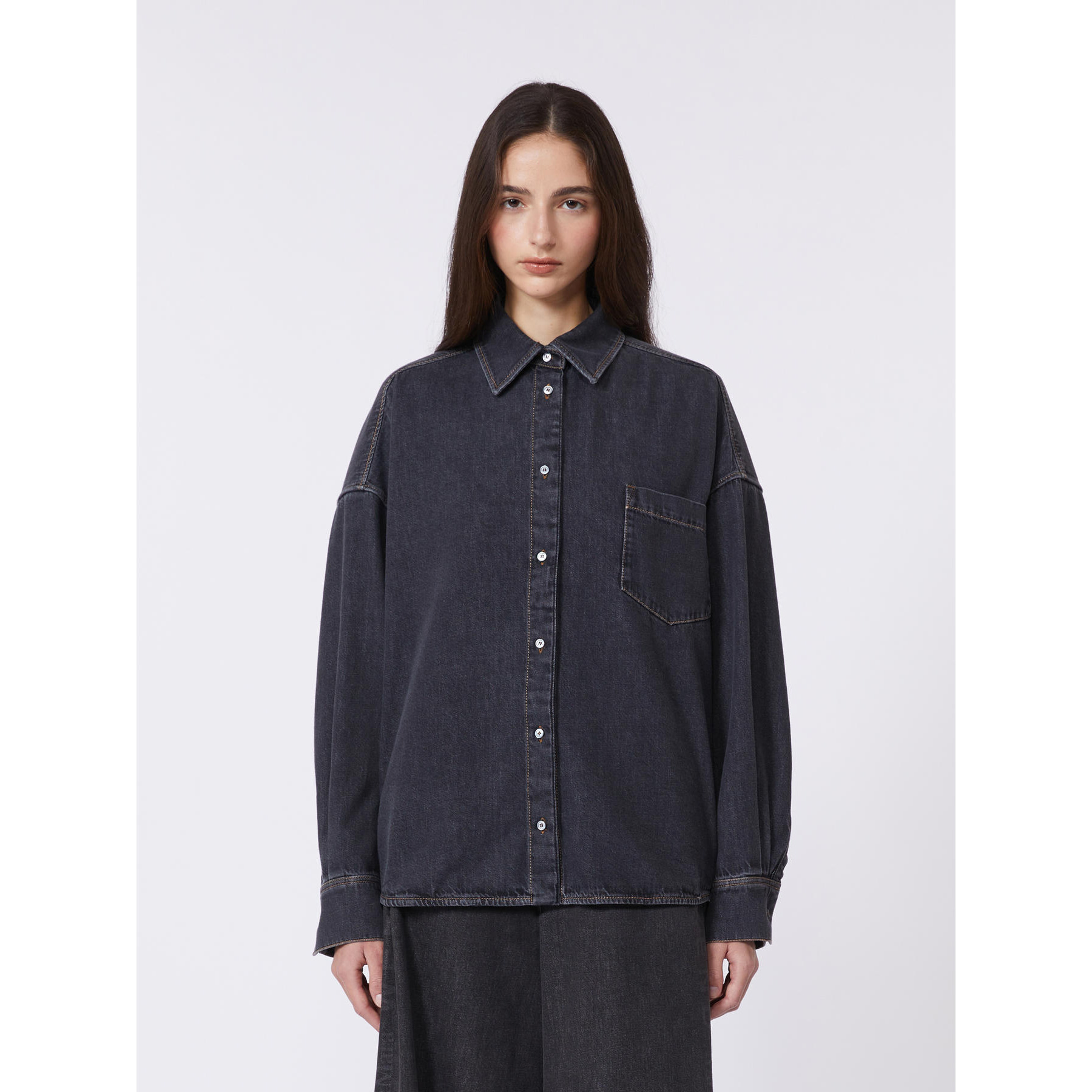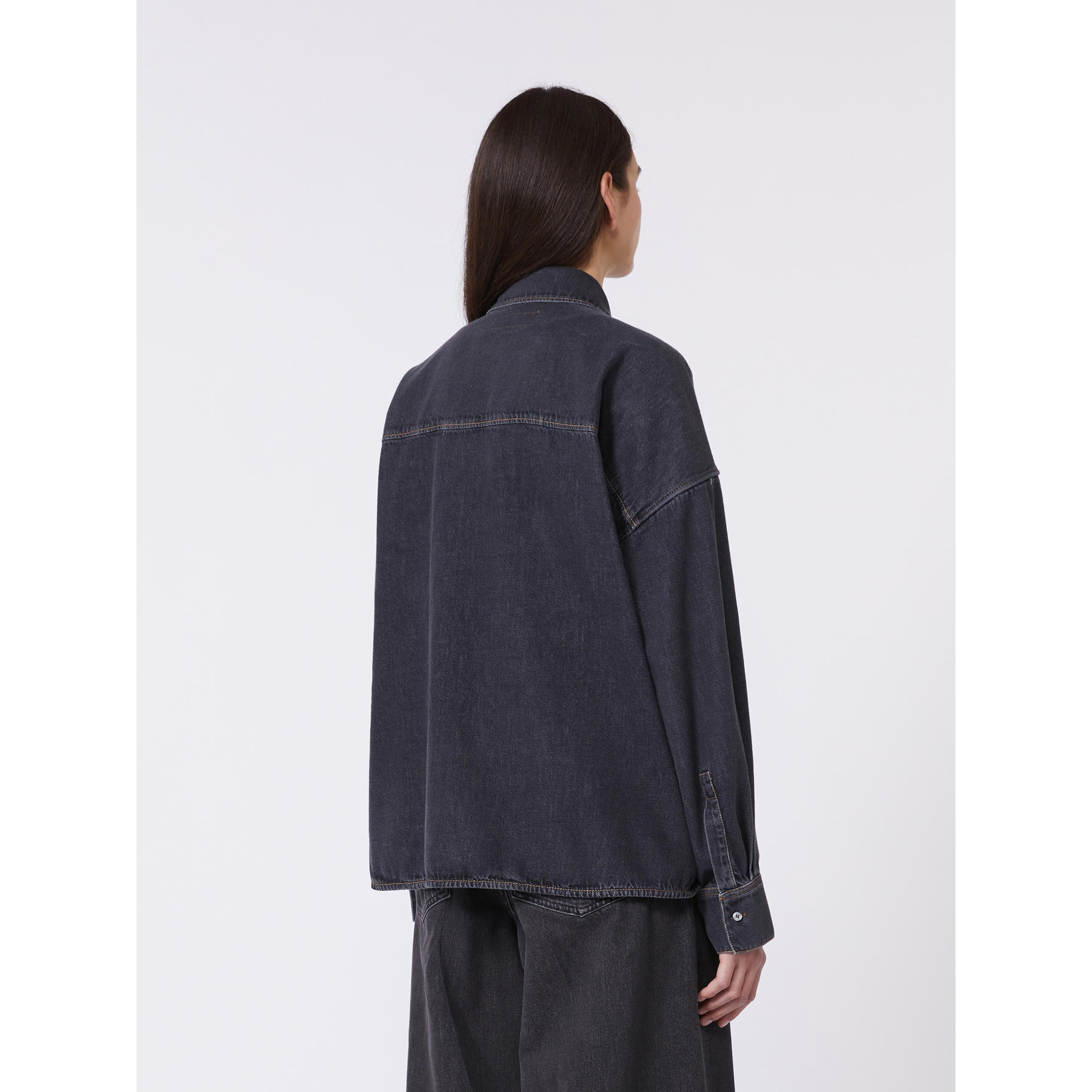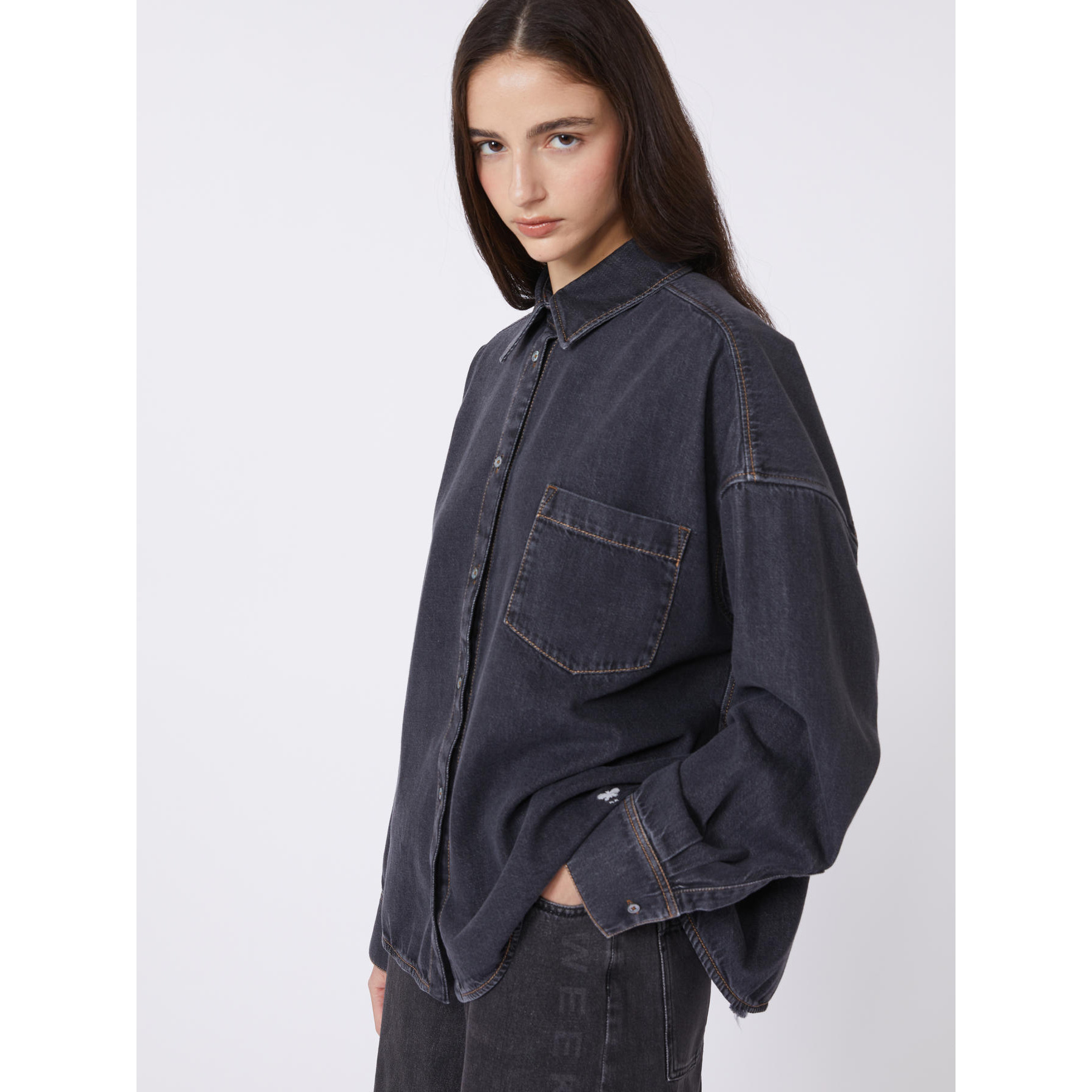 Camicia oversize con classiche impunture stile denim color tabacco e taschino sinistro applicato sul petto.