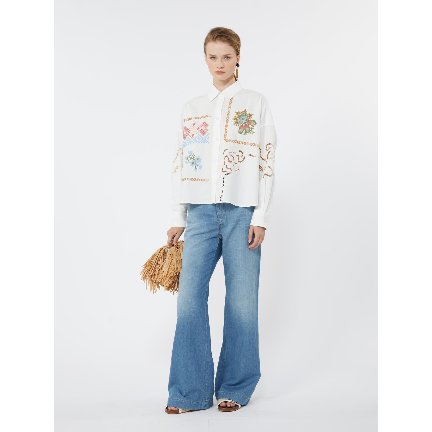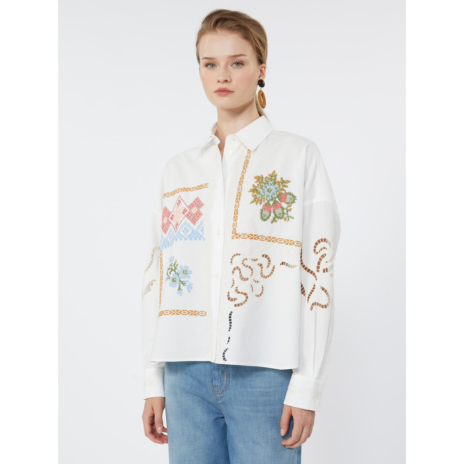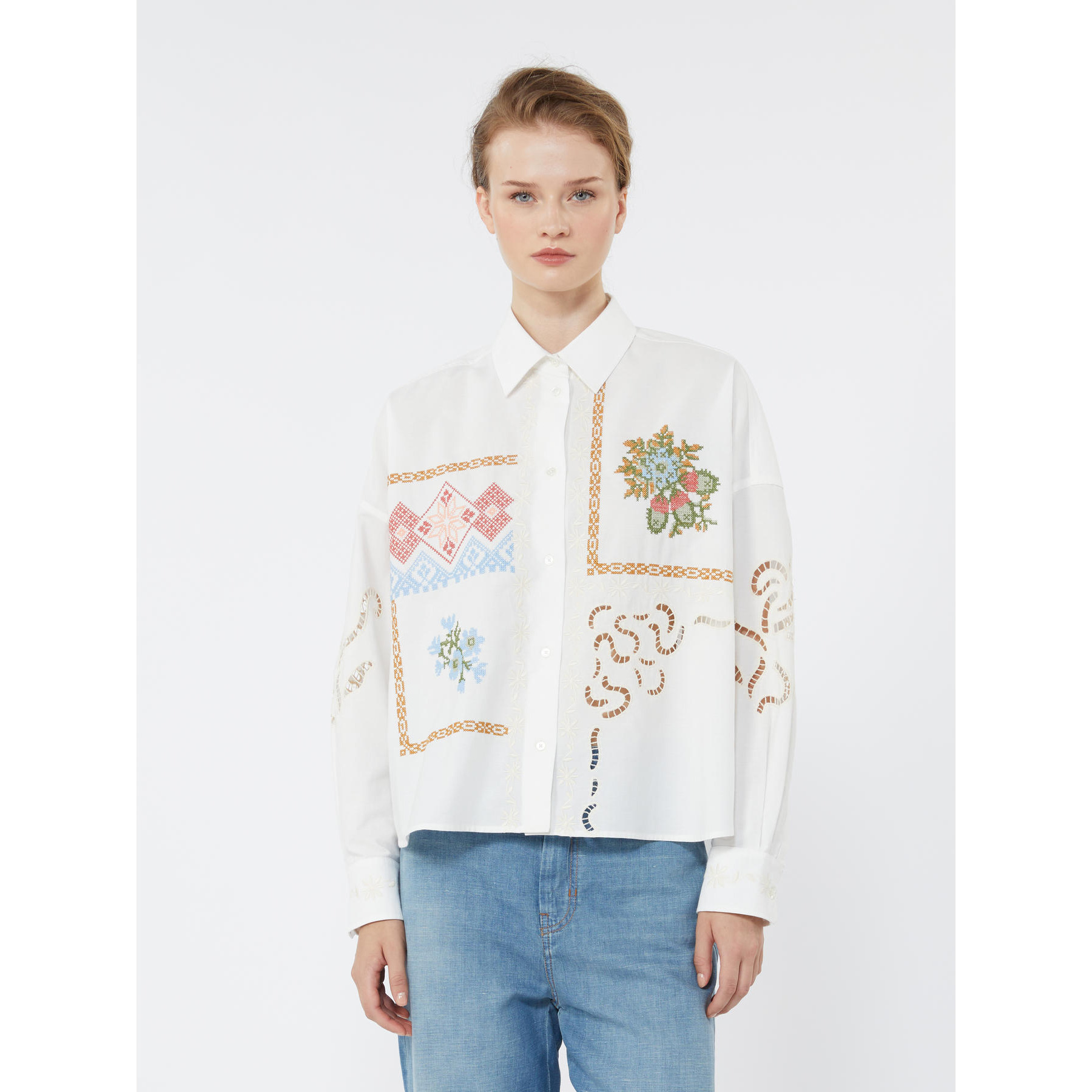 Camicia in popeline di puro cotone con colletto classico e maniche lunghe a giro basso. I motivi floreali ricamati a punto croce sul davanti e i dettagli in Sangallo impreziosiscono il capo. Chiusura con bottoni. Linea cropped.