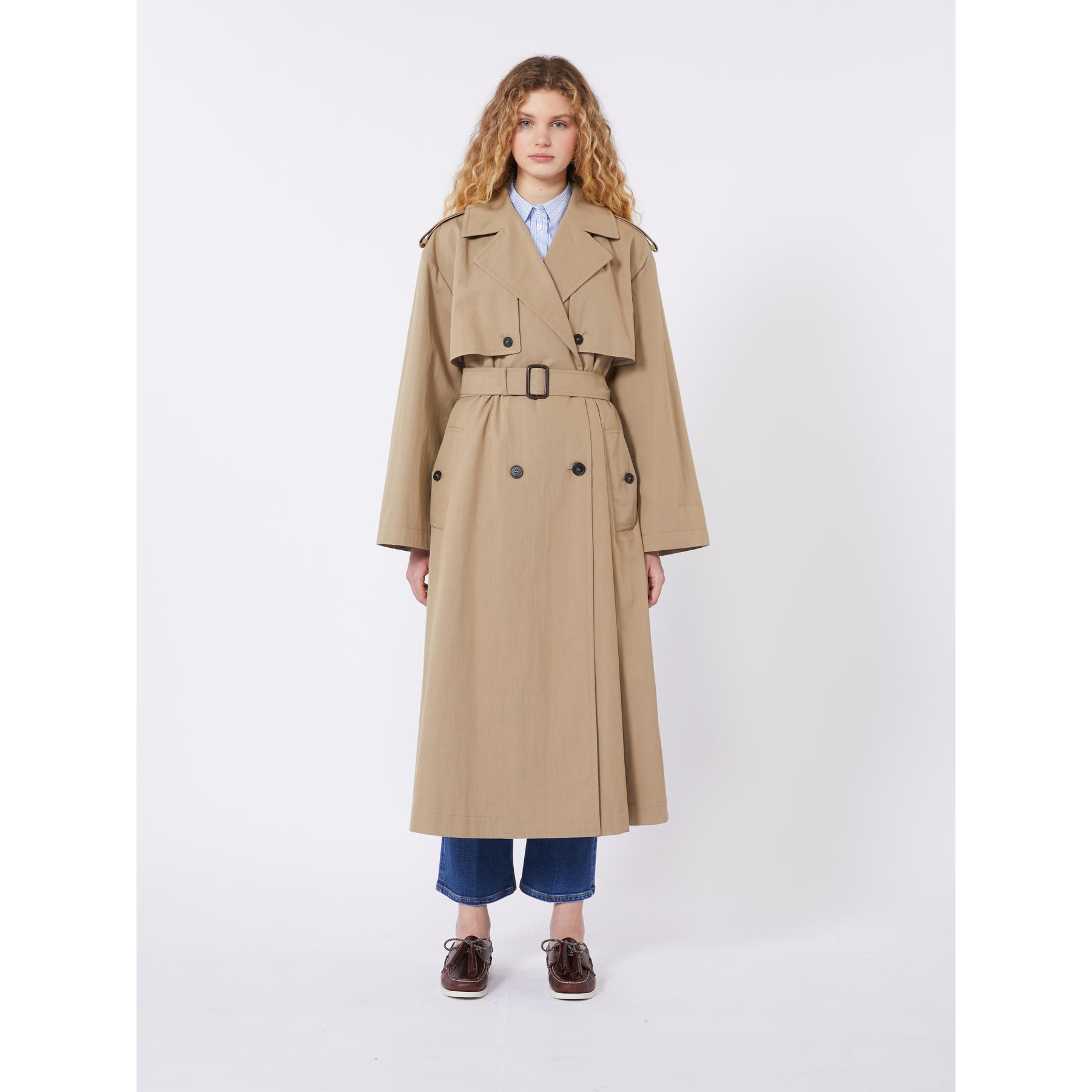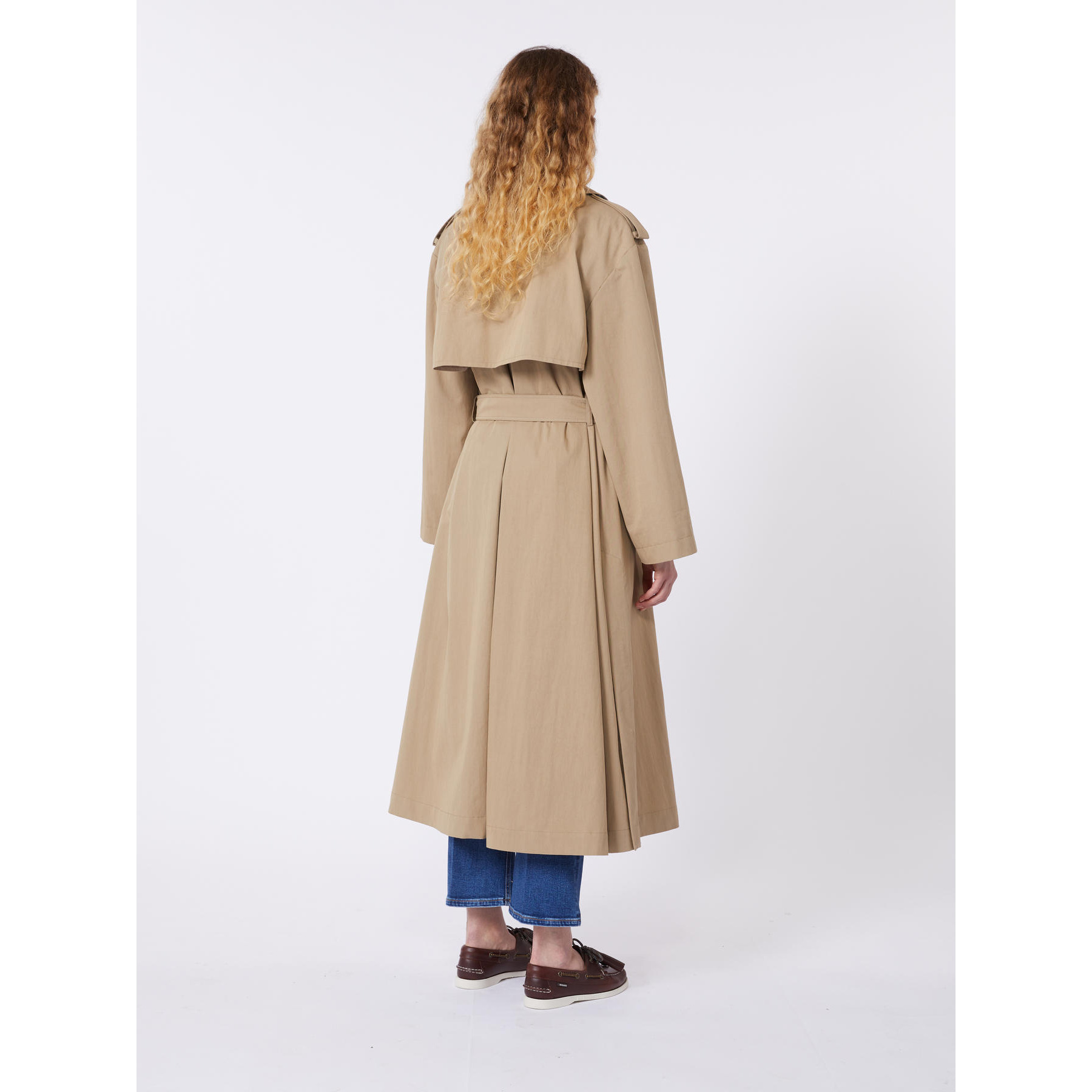 Trench doppiopetto dalla silhouette femminile, svasato al fondo e con cintura abbinata per evidenziare la silhouette.